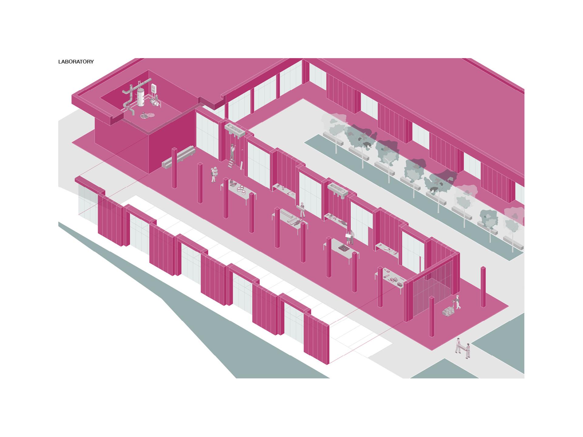 The multipurpose centre was designed to be realized through partial self-build: the mesh of reinforced concrete pillars and beams that make up its skeleton, the covering and restrooms must be designed and built by qualified technicians. Once this frame is done, various functions can be added inside, like the café/restaurant, shops and various profitable businesses (whose dimensions can be adjusted by moving the prefabricated panels that delimit them) and the laboratory. The laboratory is the hotbed of the participated construction, the space where the technicians and the fragile individuals work together to plan and realize the finishing elements of the structure of the centre and the residential buildings; the laboratory construction is thus preparatory to the houses’.