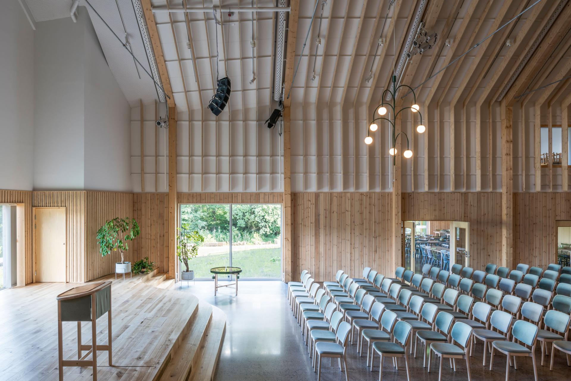 The materials are not so luxurious as you might expect for a church. Almost everything is made out of wood and kept neutral, with no symbols. It's easy to feel quite small in a traditional church. In this building you will not be diminished. The wood contributes to the warm feeling.