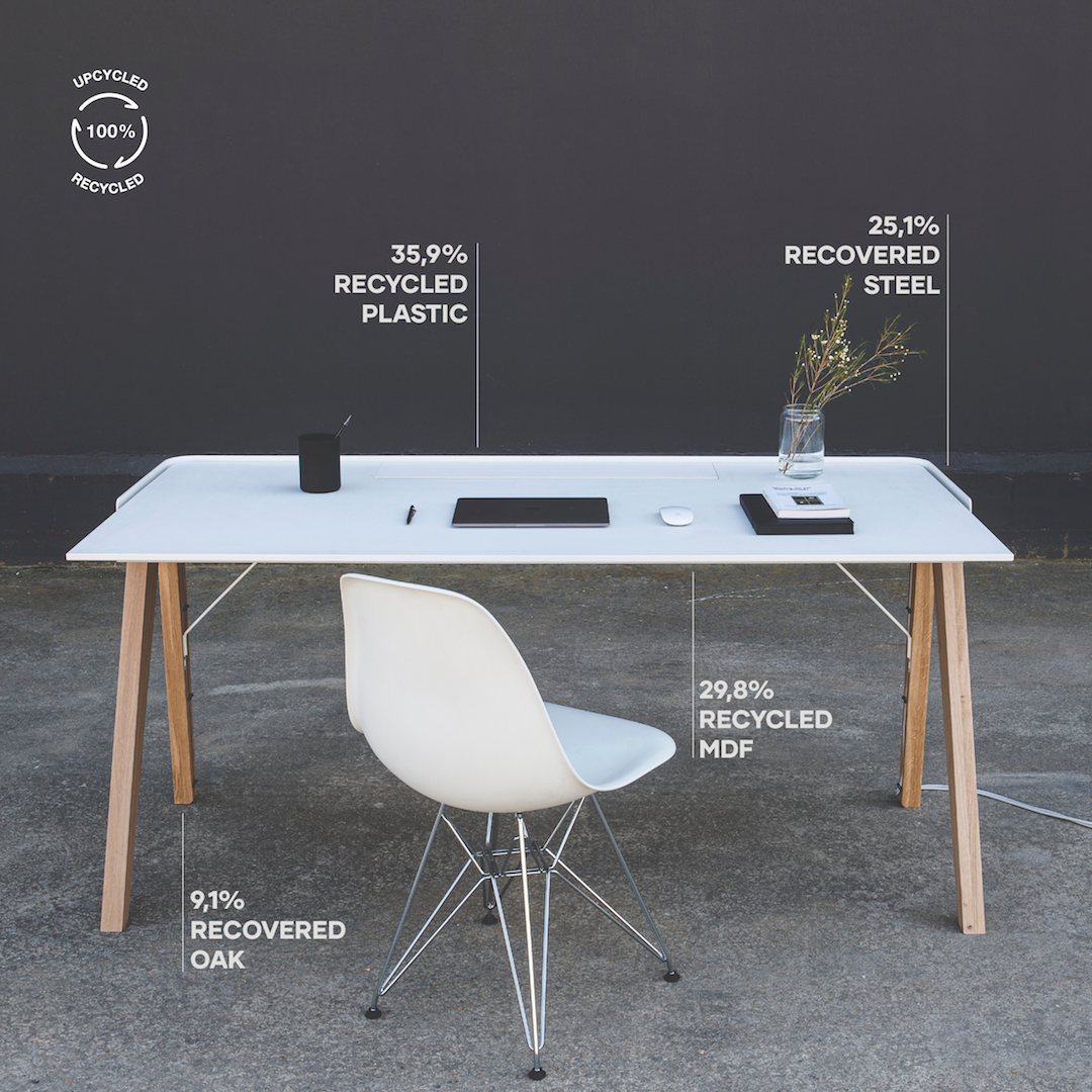 Based on the weight of materials used, the FD desk is 65.7% recycled (MDF and Durat®) and 34.1% recovered (steel and oak) what leads us to 100% recyclability at the end of life of the desk.