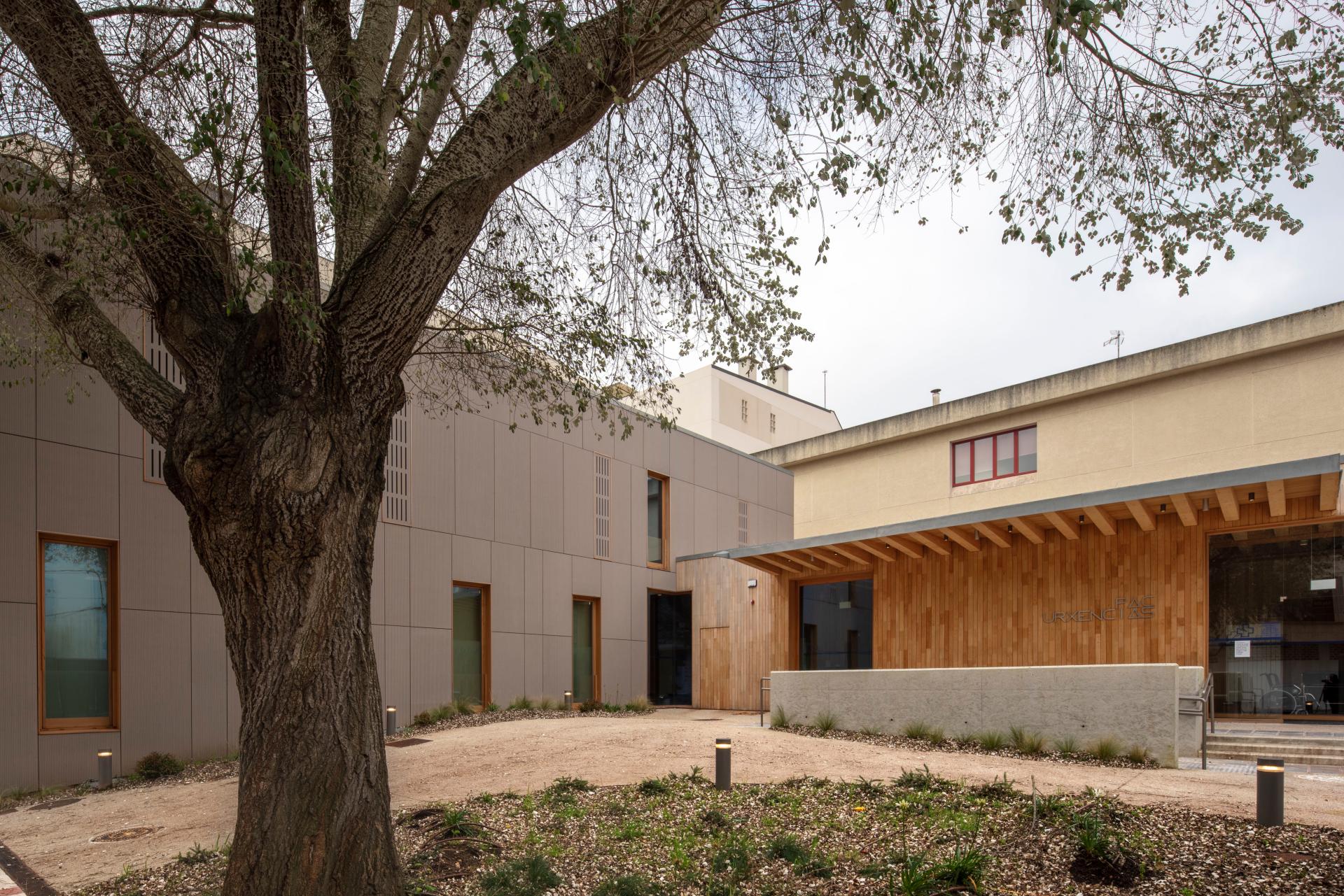 The aim was to free up space on the plot for access and at the same time create a small garden, conserving a magnificent specimen of white poplar (Populus alba), which has provided a place for the people who live there to meet and enjoy. The empty space on the plot was landscaped with mounded gardens, on the one hand to protect the existing tree, thus separating it from the circulation areas; and on the other, to create a green barrier in front of the windows of the consulting rooms, ensuring the privacy of these spaces.