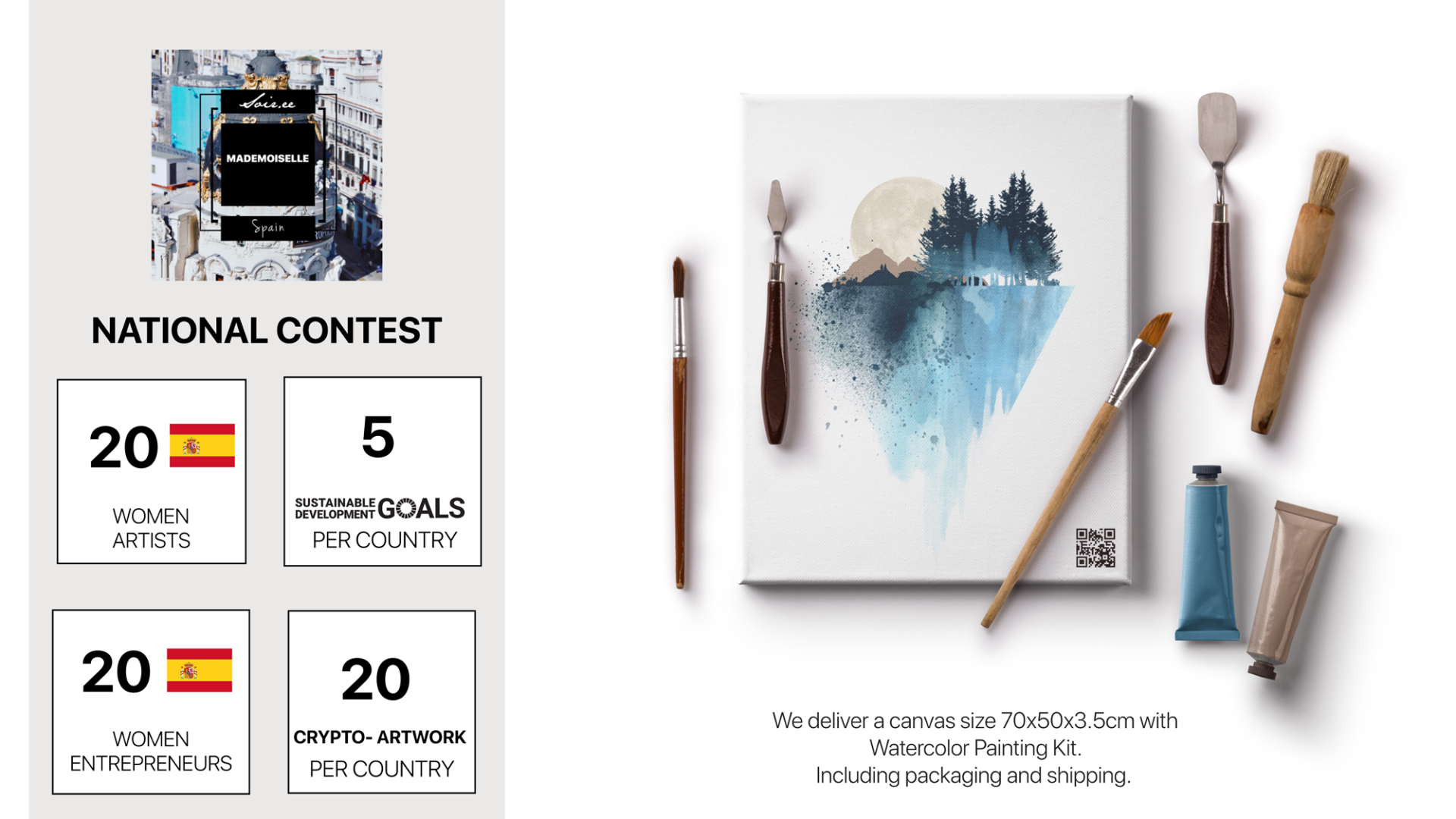 - STEP4 - SOIR.EE makes available to the 20 winning artists per country a Watercolor Painting Kit, 24 Colors for the production of the artworks. which includes a canvas size 70x50x3.5cm with its technology implemented. Includes packaging and shipping.