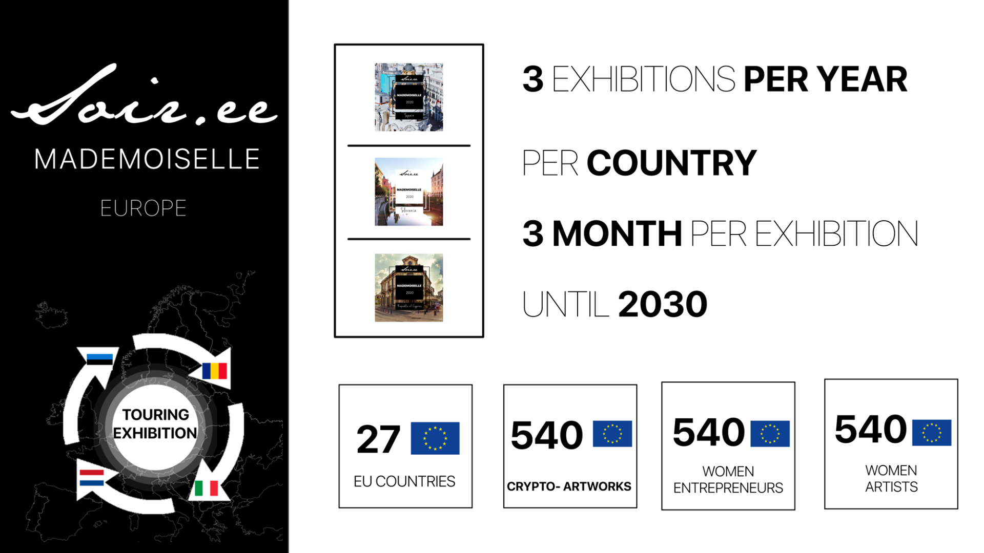 - Displaying SOIR.EE artwork simultaneously for three months, three times per year across all 27 EU Member States.