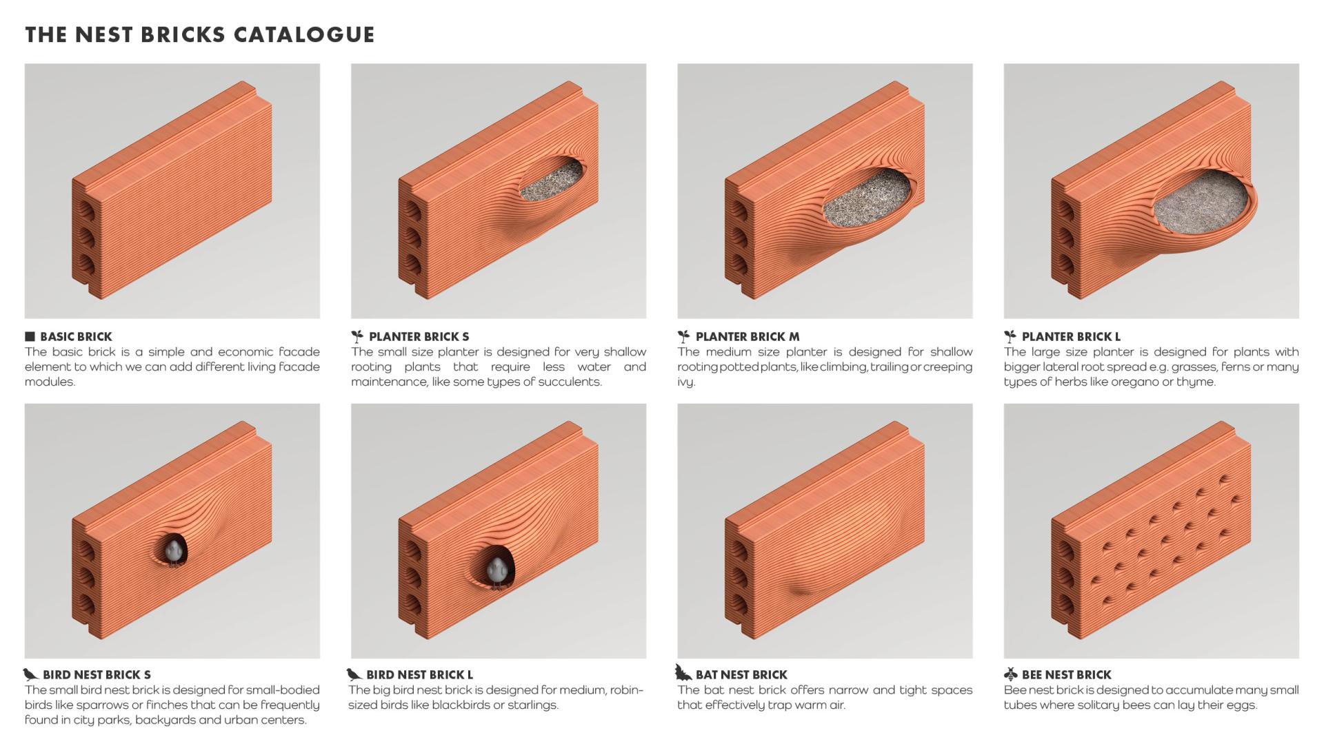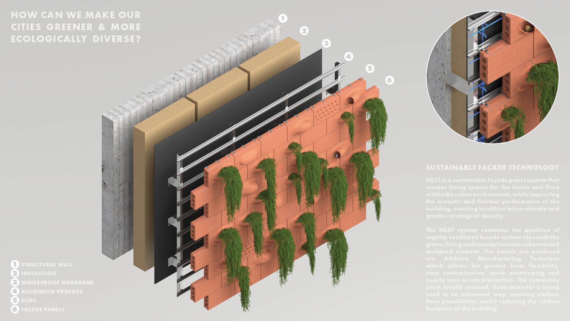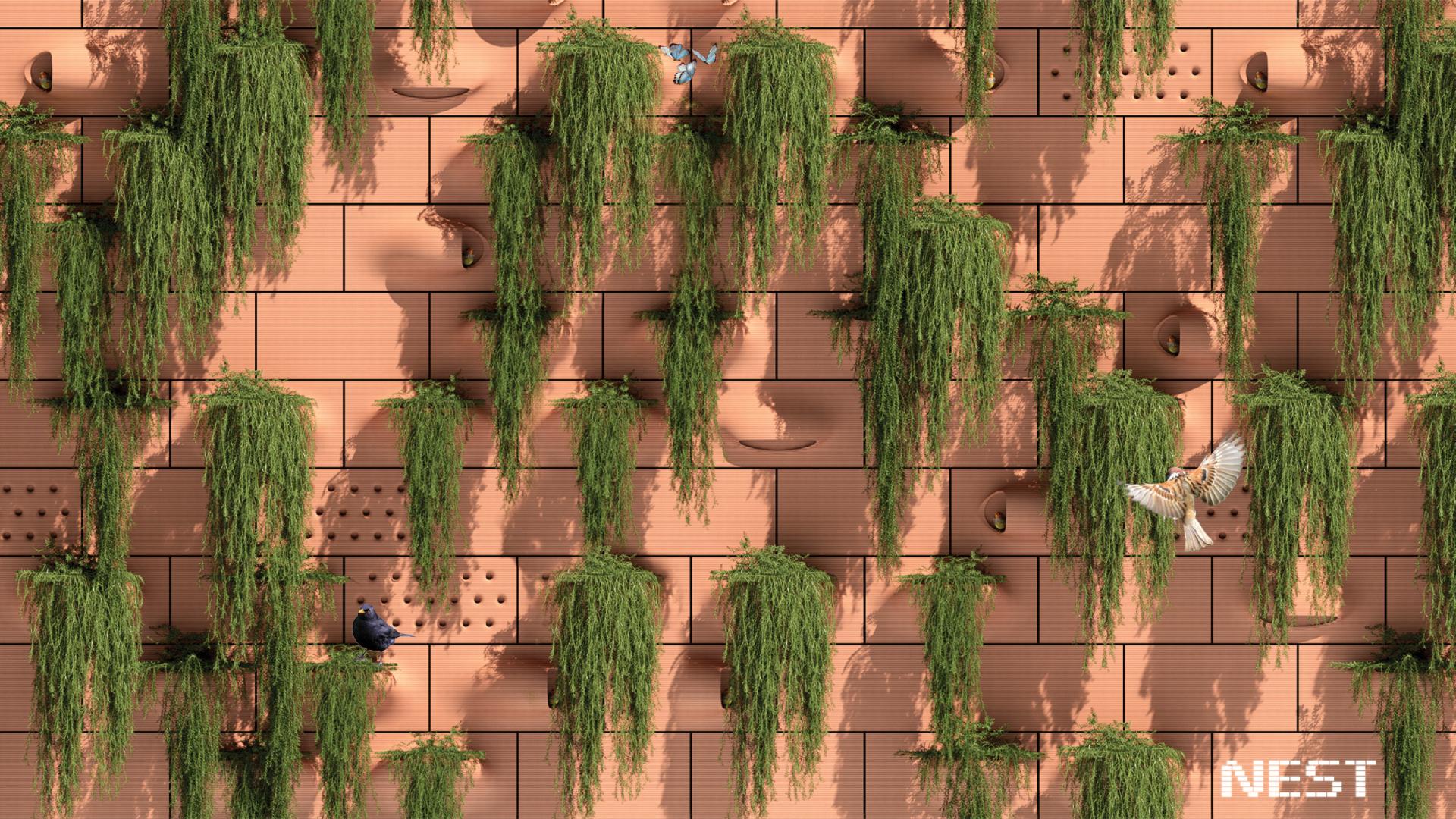 NEST is a sustainable façade panel technology that creates living spaces for the fauna and flora within the urban environment, while improving the acoustic and thermal performance of the building, creating healthier micro-climate and greater ecological density. We propose an ecological façade system which would be made not through plastics as is common today, but through sustainable ceramic/clay additive manufacturing techniques. The façade panels are produced from locally sourced clay that is sustainable and clean from toxic components. The parametric design of each façade panel is driven by the research on the local species and environmental challenges of the different climatic regions. They are tailored to create specific environment (dimensions, porosity, structure, texture) that will allow for the passive or low maintenance growth of the certain plants, or places to nest for desirable species of insects, birds and bats. The façade panels offer a flexible and modular solution that can be used in various, interchangeable combinations and can either upgrade existing buildings or can be incorporated into new builds themselves.