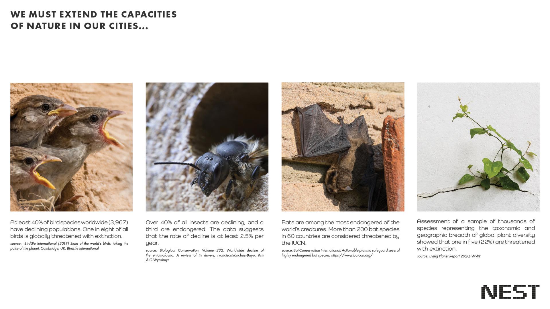 PROTECTING BIODIVERSITY | 1 m2 of Nest Façade can provide up to 10 different and unique habitats for plants, insects, birds or bats. An average three-storey building façade, 10m x 10m, can provide up to 1000 individual habitats.