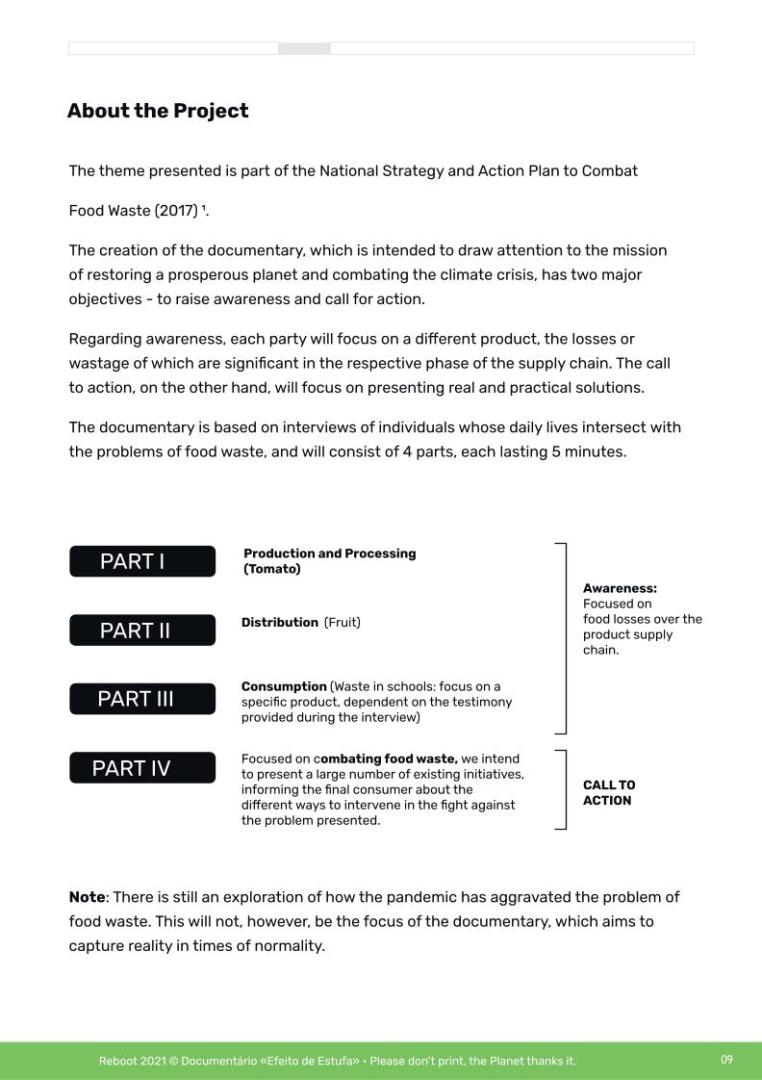The documentary attempts to capture the reality of food waste in each of the phases of the supply chain, in Portugal, by interviewing experts and collecting imagery in situ.