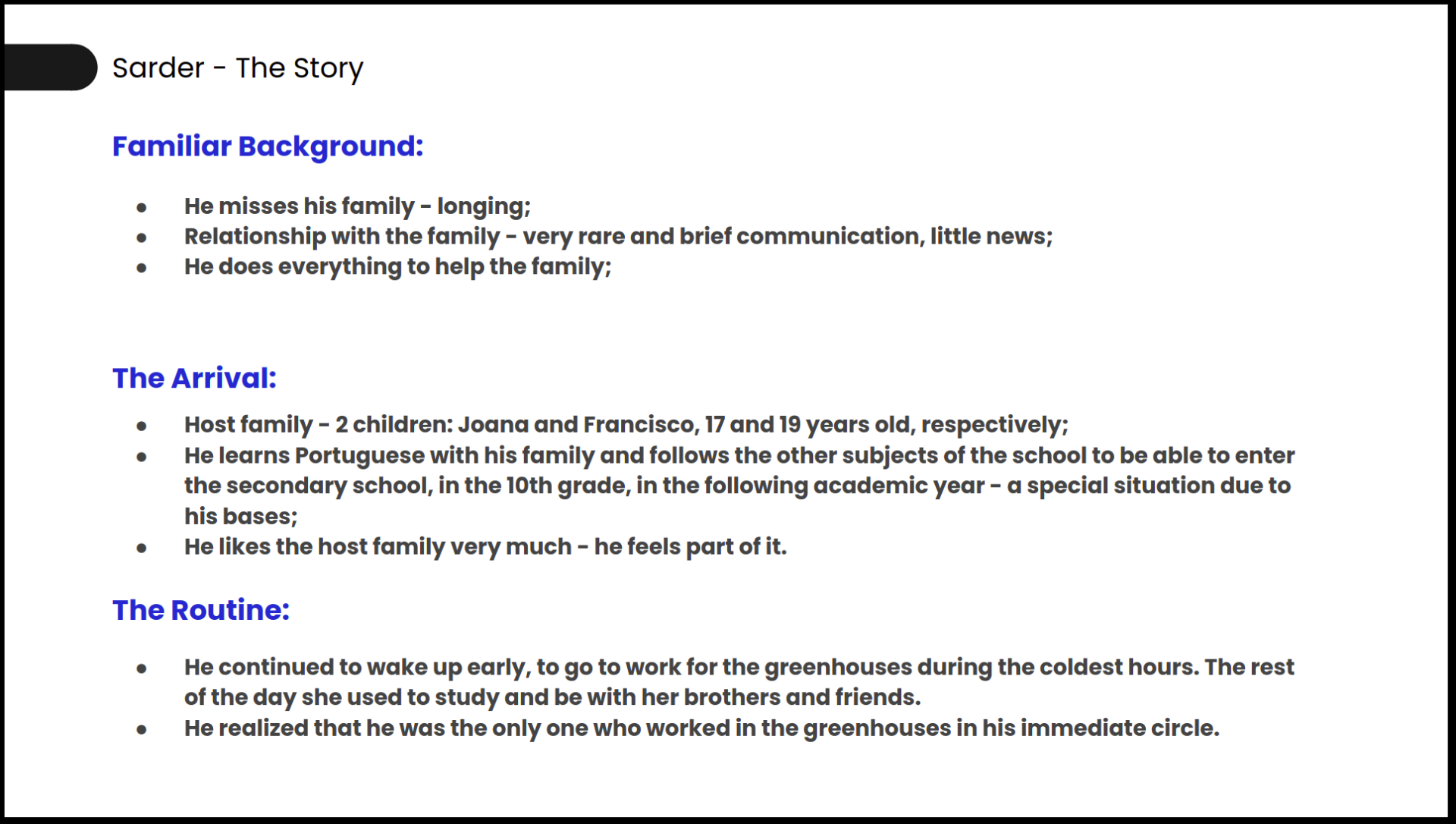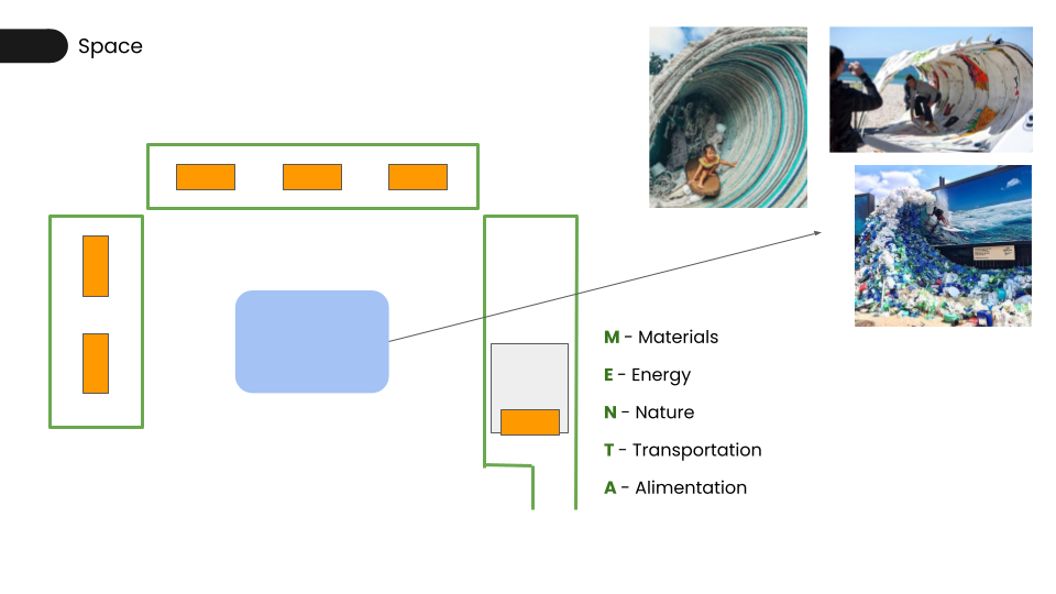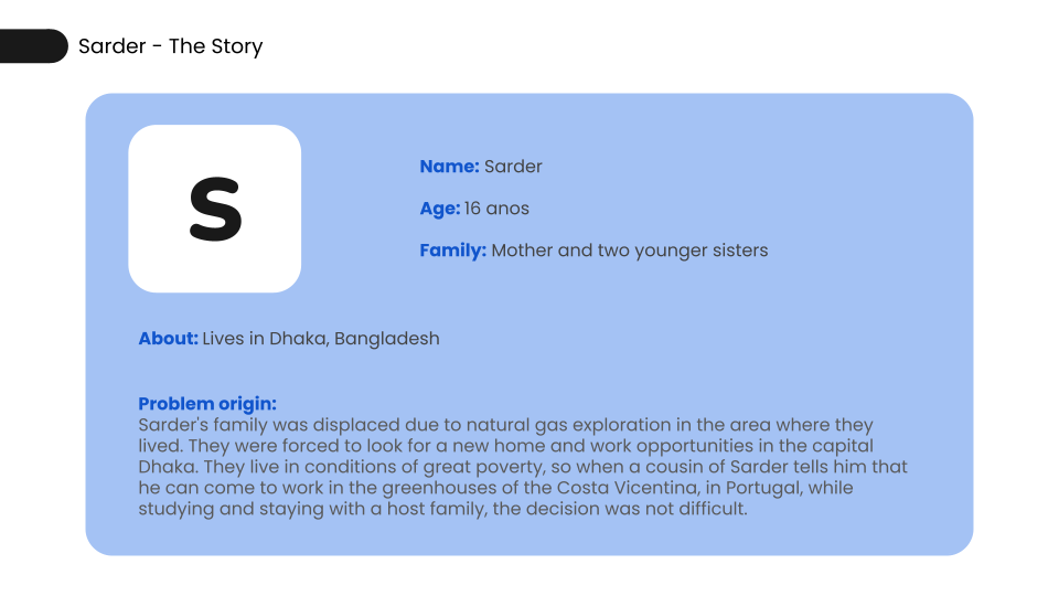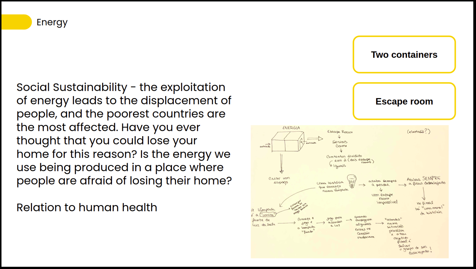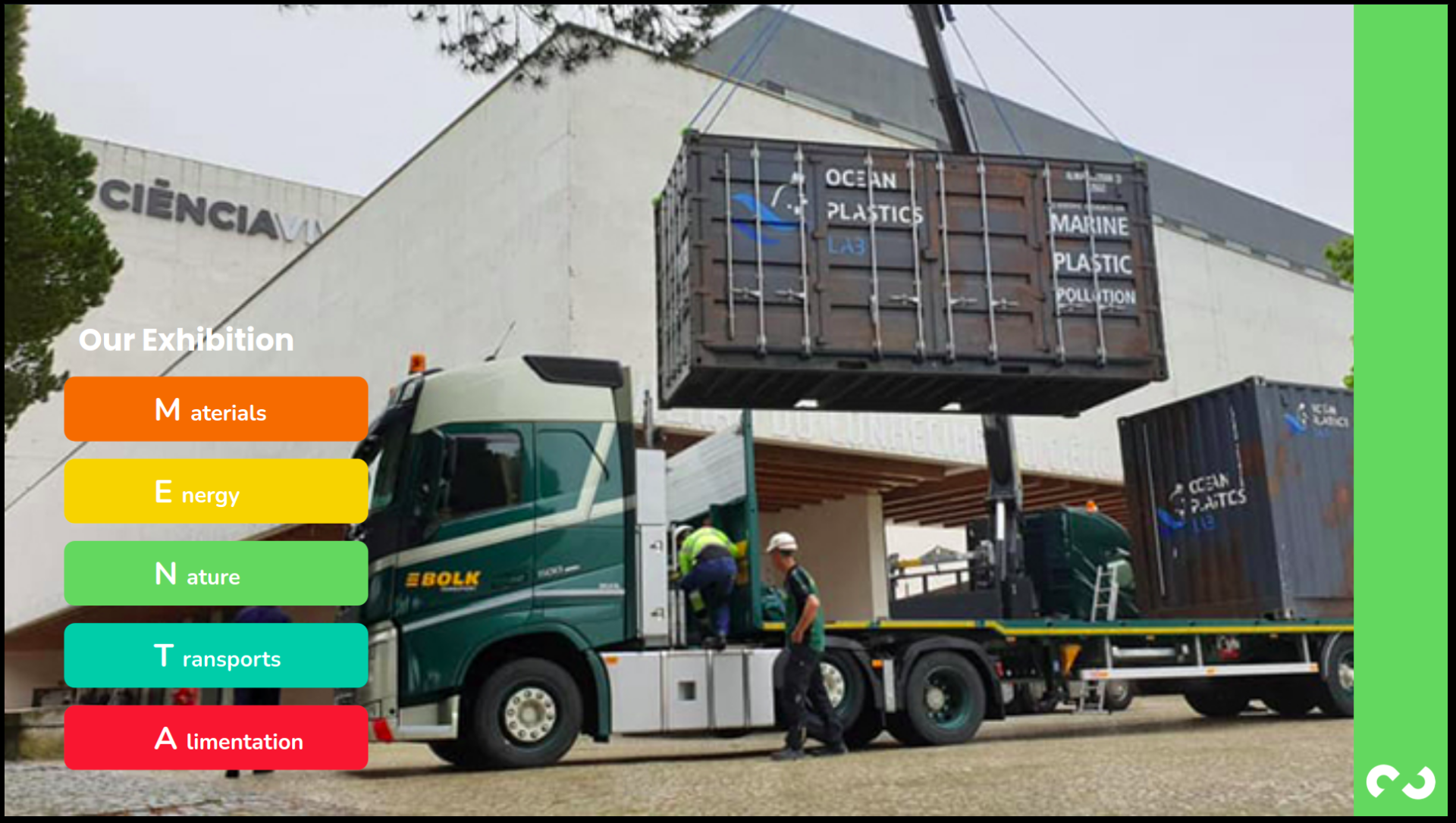 - An immersive itinerant exhibition with five sustainability themes: materials, energy, nature, transport, aliment (MENTA). This exhibition is constructed based on the story of Sarder, a Bangladeshi boy, that becomes a climate refugee. He flees to Portugal and finds a whole new world working in the Costa Vicentina Greenhouses with other emmigrants. The contrast between his country and the European lifestyle is used as a motivation for introducing thought-provoking subjects within the exhibition, mimicking Sarder's questioning of our own realities and allowing us to introduce Social Sustainability as a topic of discussion