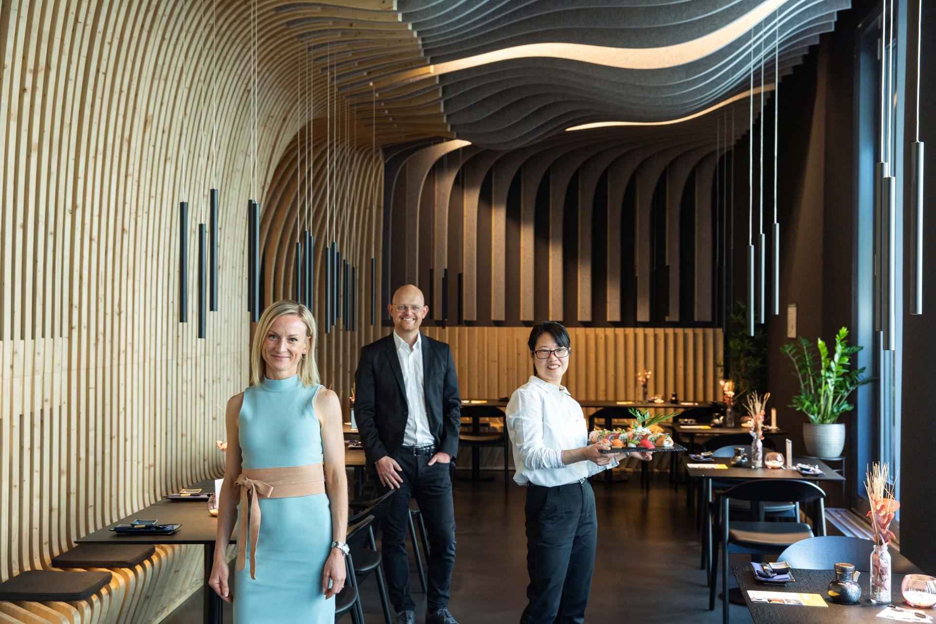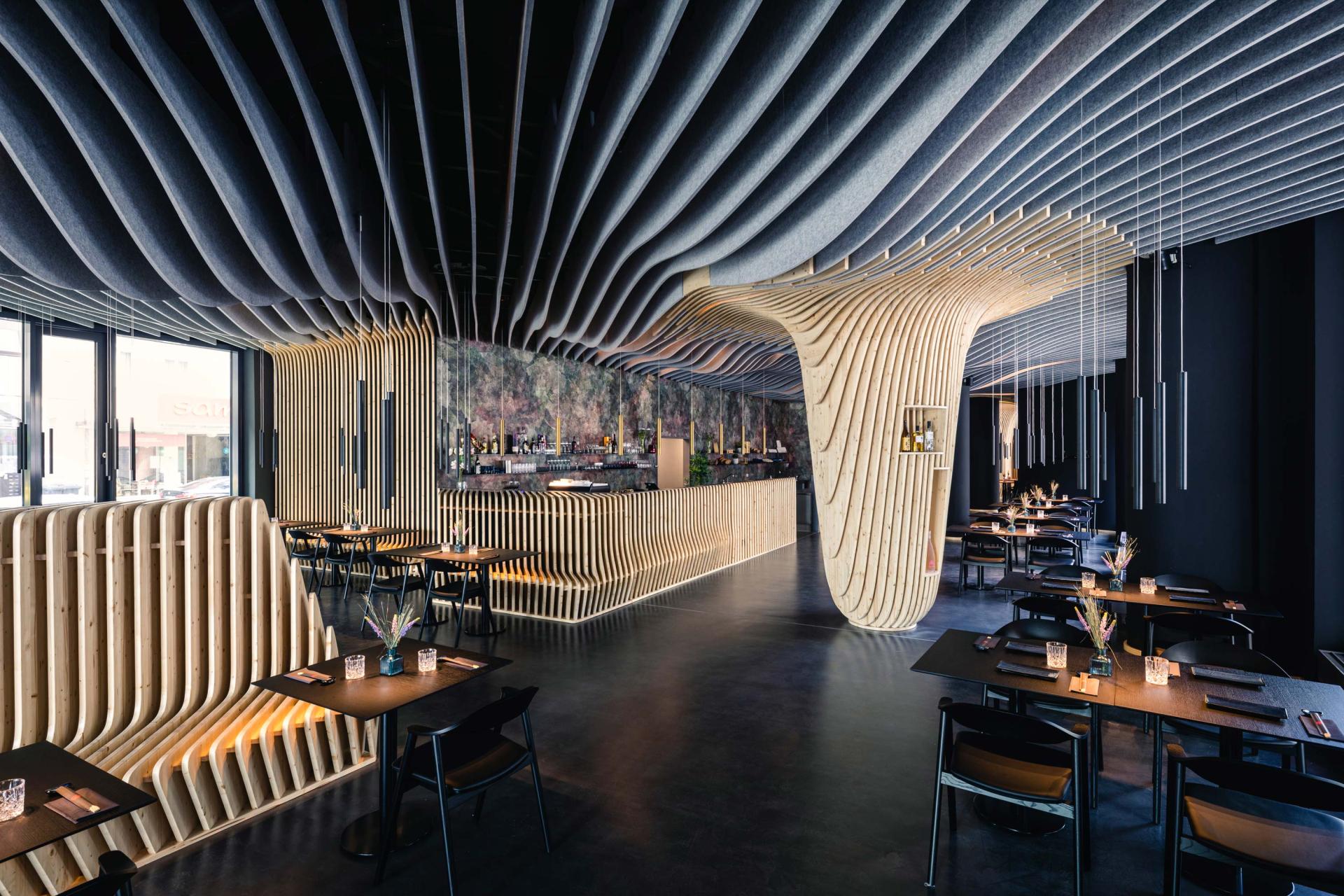 The flowing design is based on a modern interpretation of Japanese culinary culture and tempts with its atmosphere. The organic structure consisting of felt- and spruce fins flows through the dining area and playfully covers ceilings, walls, and columns. The room becomes a perceptible sculpture with the guest in the center. Following the Japanese aesthetics, contrasts between dark furniture and bright spruce fins create an even balance.