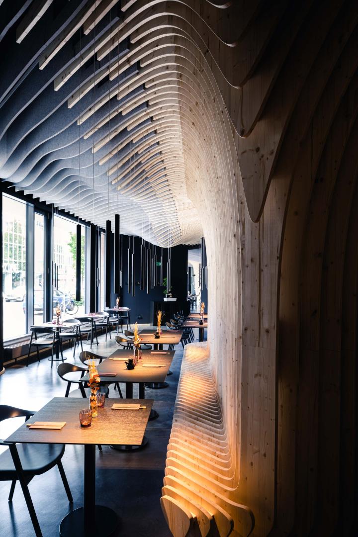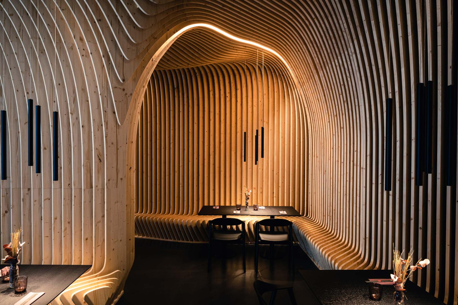 One of the key objectives was to place the guests at the center of the walk-in sculpture. They can choose between a more intimate seating area in the back and an open atmosphere in the front bistro area. The structure embodies our vision of striking graphical and iconic design. It stimulates the guests vision through the flowing structure as well as the smooth haptic can be felt on the wooden fins.