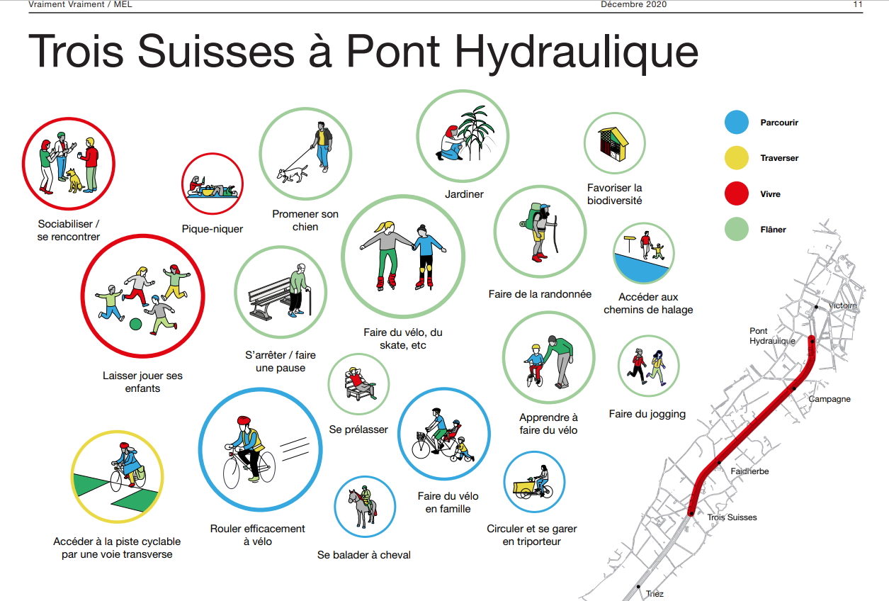One of the challenges of the project is to create a mix of users on the Grand boulevard where cars are so far overrepresented in order to bring in / bring back users who are distanced mentally and physically: residents, elderly, schoolchildren, youth groups, families.