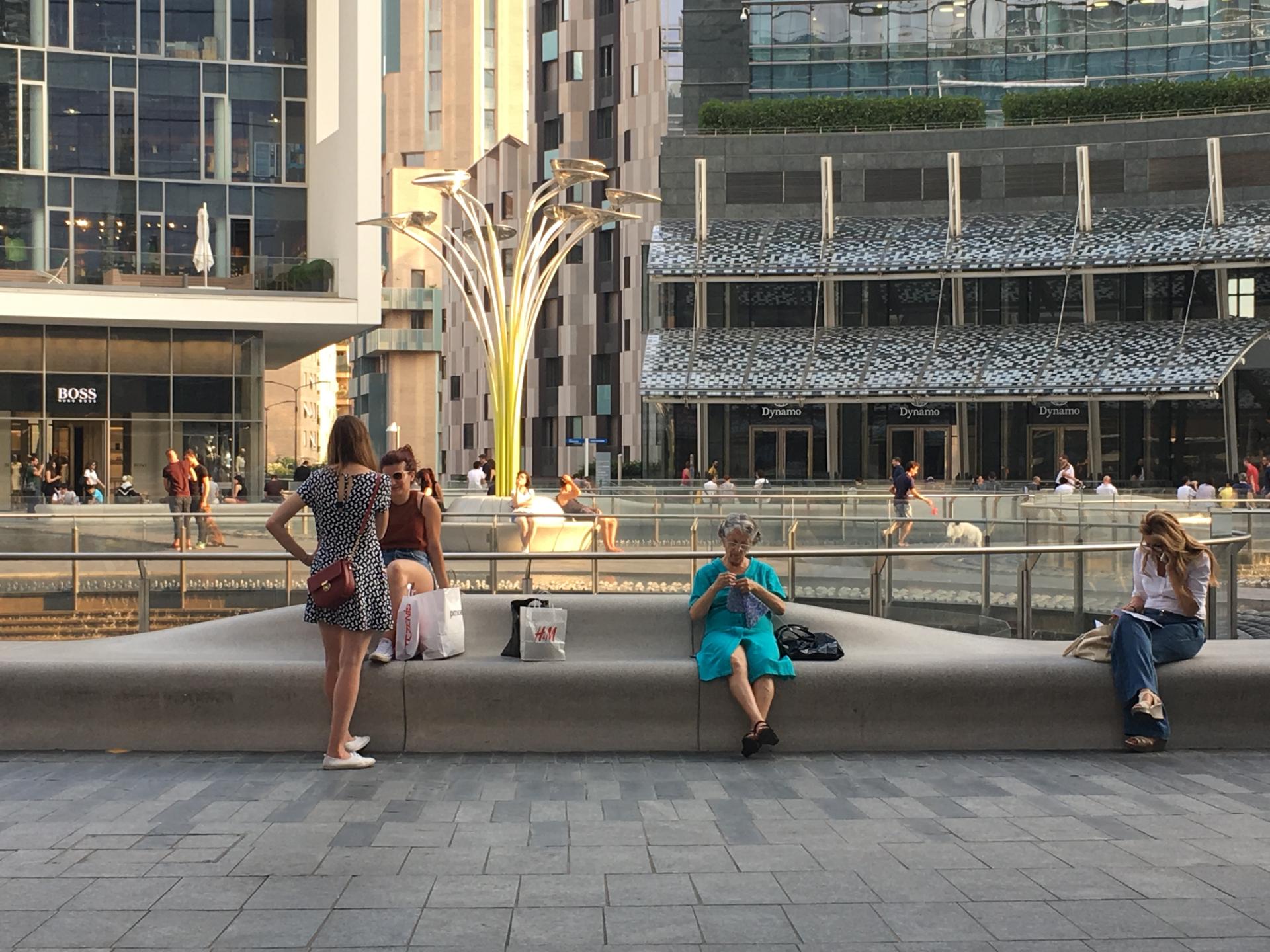 The inclusive design offers wide paths and lush seating, detached from the need of commercial consumption. Long elements to sit are surrounding the water basin of Gas Aulenti Square, offering views towards the buildings and shops or towards the water and the tree. They are placed in appropriate distance to the high buildings to create physical comfort and a centred, yet not surrender position. Also the reflection of sky scrapers on the water surface helps to feel more comfortable within the horizontal barrier.