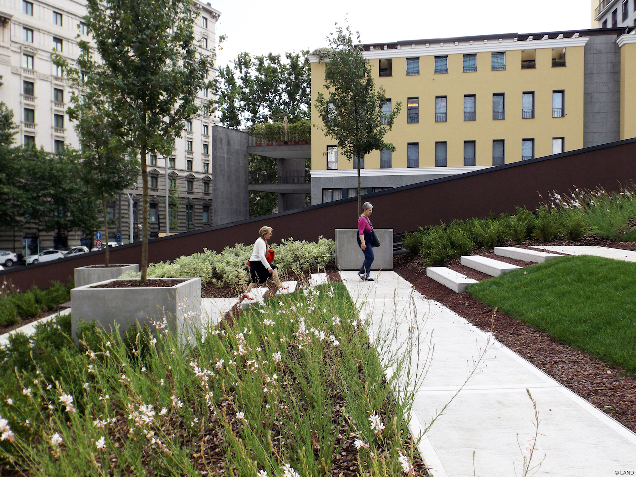 Porta Nuova represents a spark, it was the beginning of a paradigm change for the city as people realized that such thing, an enormous, walkable, green-grey public space can be created, giving the urban space back to its citizen. By means of an agreement, the local real estate COIMAR developed the area in close cooperation with the municipality and called out a public competition for all project parts. This particular approach helped to build a structure that continues building new visions with every step: Beginning with a consultancy for a public space plan by Gehl Architects, attractions such as the UniCredit tower as Italy's highest building, the Bosco Verticale by Stefano Boeri or the Biblioteca degli alberi, the library of trees by Inside Outside, the Porta Nuova district represents a creative development ground which became an accessible, human-centered and inviting location by the three realized and 4 ongoing public space interventions by LAND that make the passage and stay in this neighborhood a special experience. The accessibility of the of the public and private space in Porta Nuova connect the new district with its three neighbourhoods and allows the vivid exchange of the diverse areas. The place-making - the designed expansion of the public space - created areas for new temporary and permanent activities. The landscape intervention is part of a wider redevelopment operation of public and private nature and has covered the entire project chain. From concept to the creation of open spaces, the interventions were directed towards the overarching goal to connect Milan's urban nature within each other and with the bigger natural axis, the green rays. Porta Nuova undoubtedly represents a unique opportunity to promote urban quality and to explore, rethink and test new ideas with the aim of promoting the sustainable development of cities.