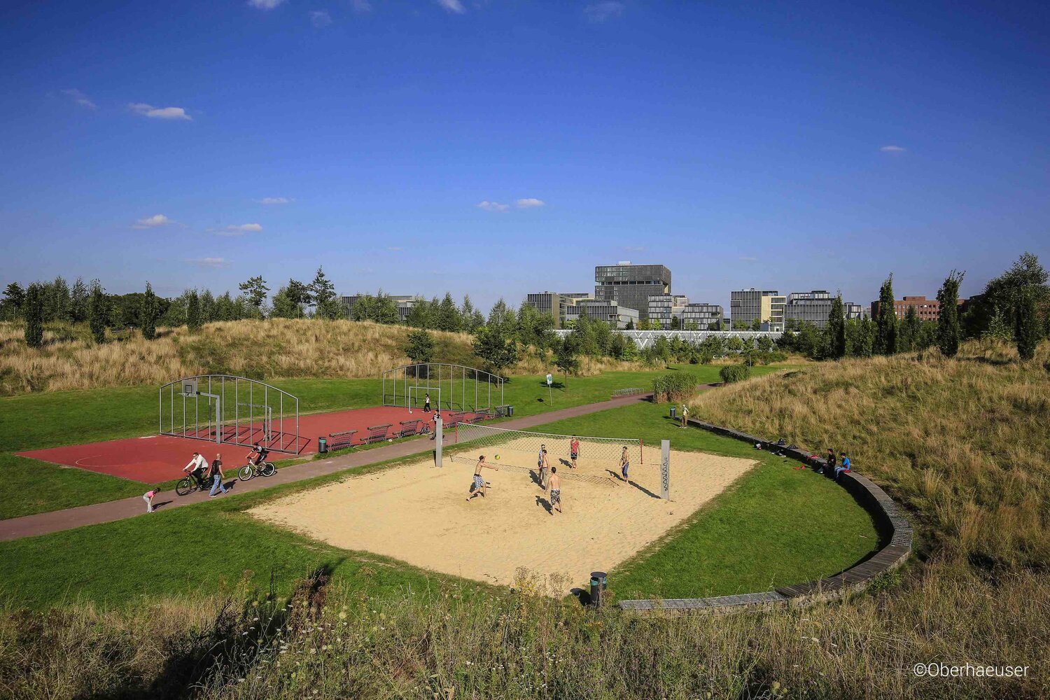 The strategy "from grey to green" for the entire city is using intensive and intelligent land-use and spacial betterment without new land consumption. The goal is to transform urban landscapes with social-compatible and preparatory spacial design interventions to reach a perceptible green future. The Krupp park is the beginnig of the urbanistic development of the Kupp belt, the 230 ha wide natural development area which re-connects the city center of Essen with its water. During its construction, 400.000 m3 of soil were moved and reused, reaching a near-zero land balance in spite of the soil contamination by the former industry and creating the characteristic five hills of the park. The 12,5 ha big green surface of the Krupp park is touching the city center of Essen and betters the urban climate. It's vegetative volume provides cooling evaporation and its topography and water system offer water storage and purification, two important aspects to establish climate resilience of the site and surrounding areas. The park entails a 0,9 ha lake as rainwater deposit, filled with the water volumes of the park, the roofs of the neighbouring TyssenKrupp quarter and surrounding areas. From the roofs it arrives within a channel to the park where it comes to the surface again and flows via natural ditches into the lake. The lake water is used for irrigation of the park and is being directed to a side stream of the Emscher river to support the ecological redesign of the river system. The appearance of the water flows in the park allow visitors to actively interact with the natural environment and enrich the return of high-quality public space to locals after almost 200 years.