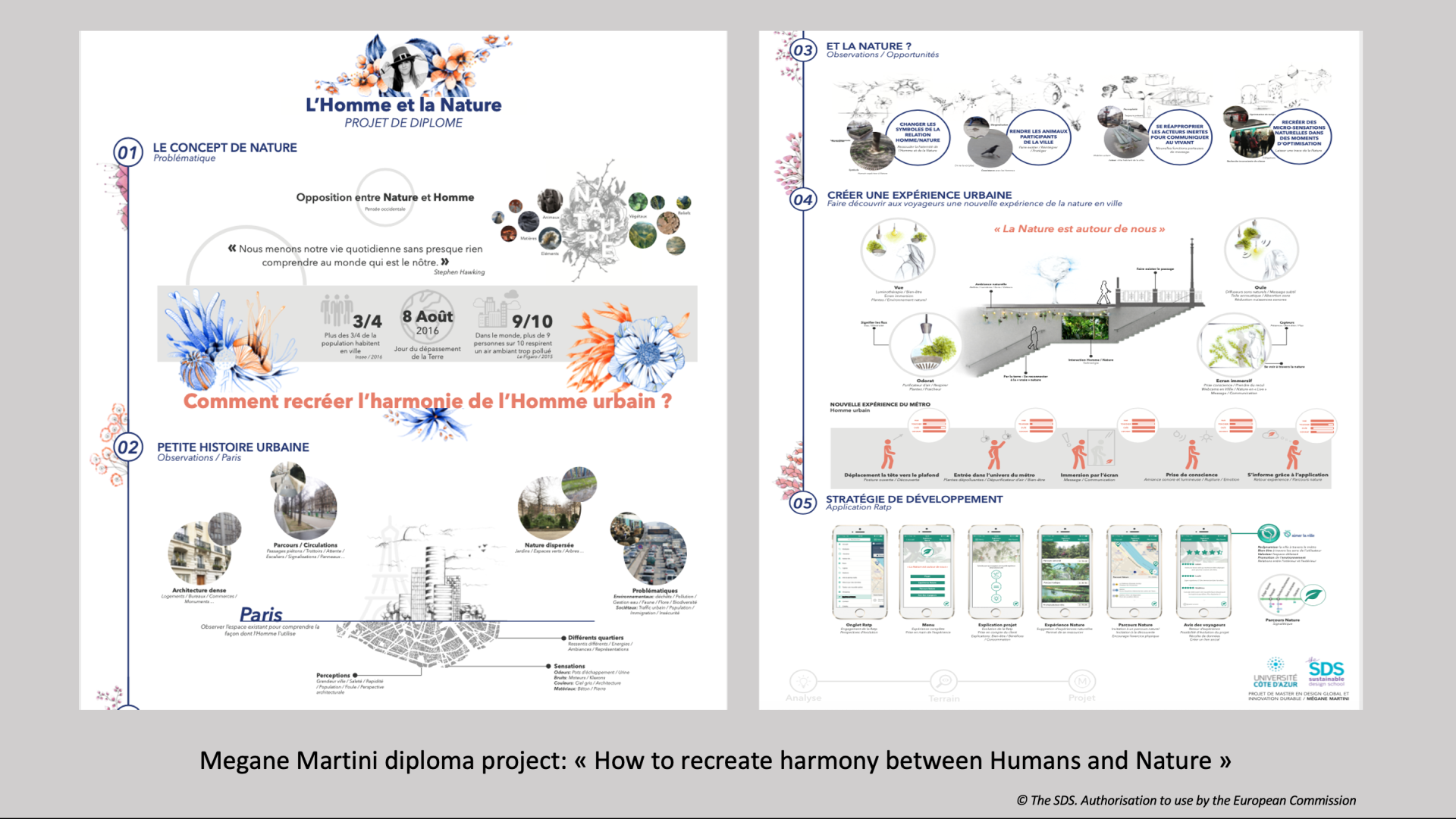The SDS students are inspired by the school to imagine new models of education. The SDS has fostered several diploma projects in the field of education: Corentin Le Guay has imagined a project called “Les petits lotis” with a new model of sustainable primary school. Justine Severino and Francesca Bianco have imagined a new program to teach the Sustainable Development Goals in kindergarden. Thomas Giraudon has developed Mithra a game to explain biodiversity to children.