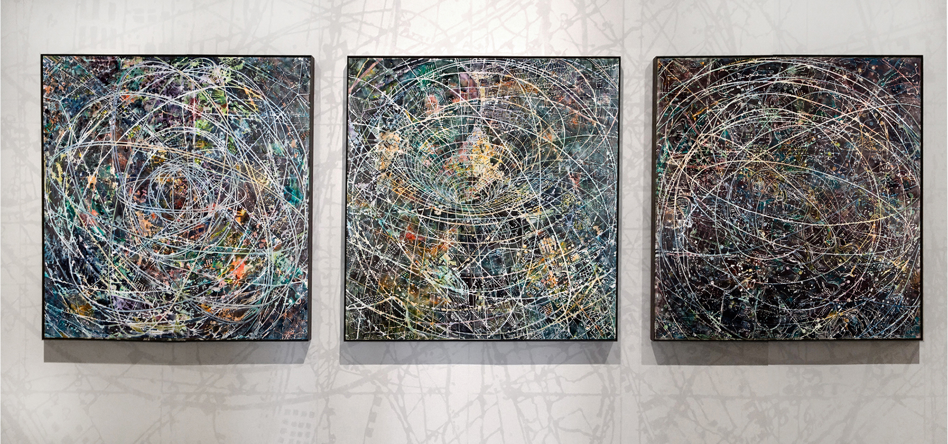 My exhibition blends aesthetics with science and sociology. Mixing diagrams of maps with radiant colors, rich surface textures, abstract forms, marks, and unique perspectives, I hope to speak a universal language through painting that creates common ground among diverse groups. The unique strength of art is that it engages people in multiple ways as it did with the people who attended my exhibition Vast Scale—Intimate Space held at the European Cultural Centre (ECC) in Venice, Italy, from May 9 through November 24, 2019. My exhibition involved three paintings in a unique installation. For the installation, one of my map-like drawings was enlarged to a wall-size mural. The drawing was reproduced with muted contrast at a huge scale, 3.35 meters by 6.7 meters. Hanging in front of this huge, map-drawing were my three paintings, Tenuous, Coalescence, and Transient. The paintings combined with the wall-sized, map-drawing stressed inclusion and a global perspective on climate issues and climate migration. The installation served to motivate people toward sustainable living by visually showing how the effects of climate crises spread outward affecting people and places everywhere. Scientists have emphasized the global nature of this problem, the human implications, and the need to work together to solve it. Stopping climate change and creating sustainable ways to live are universal concerns. My exhibition conveyed this urgent message through an aesthetic experience. The talks and presentations along with traveling the exhibition to other venues continue my efforts to educate and involve people in solving climate issues. My artworks offer people of different backgrounds and life experiences a point of entry for getting involved, being proactive, and working together to halt climate change. Success will involve hard work, changing ingrained habits, and thinking in new and diverse ways. My paintings invite people to see these challenges in new ways and from new perspectives.