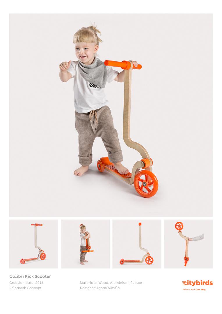 Colibri kick scooter is designed specifically for children. It is cleverly and uniquely constructed from natural wood. The horizontal and vertical frames are also wooden with their axes, locking systems, and interconnecting components of plastic or stainless steel, ensuring the materials are combined to ensure rigidity and stability of the product. It is ergonomically designed to replicate the bend of the shoulder, creating an additional and comfortable function in its carrying and transportation.