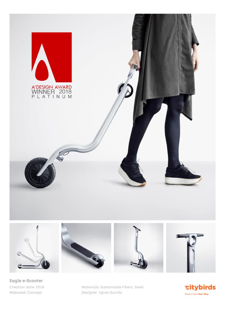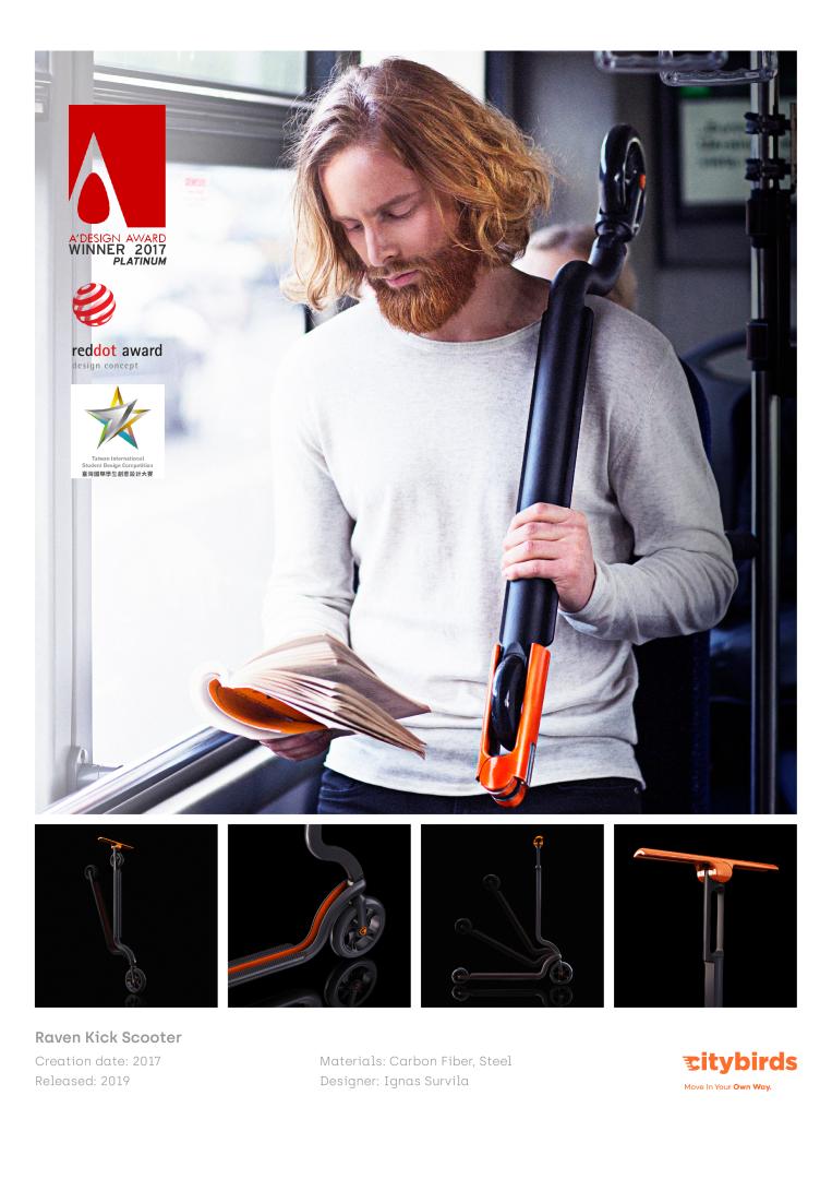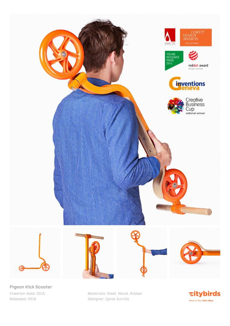 The Citybirds design concept is based on keeping similar visual characteristics for all products in order to make them recognizable and interconnected. Each individual product is named after a different bird and reflects the philosophy and concept of a particular kick scooter. For example, the Pigeon kick scooter is intended for urbanites who group together in the city street, just like pigeons, while Colibri is designed for kids resembling small city birds. Raven, is a multi-functional, compact, and personalized kick scooter that saves space, and Eagle is an electricity-driven scooter designed for modern forward-thinking adults.