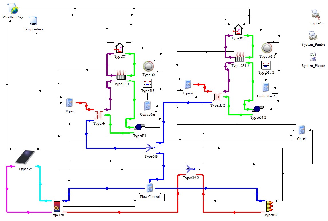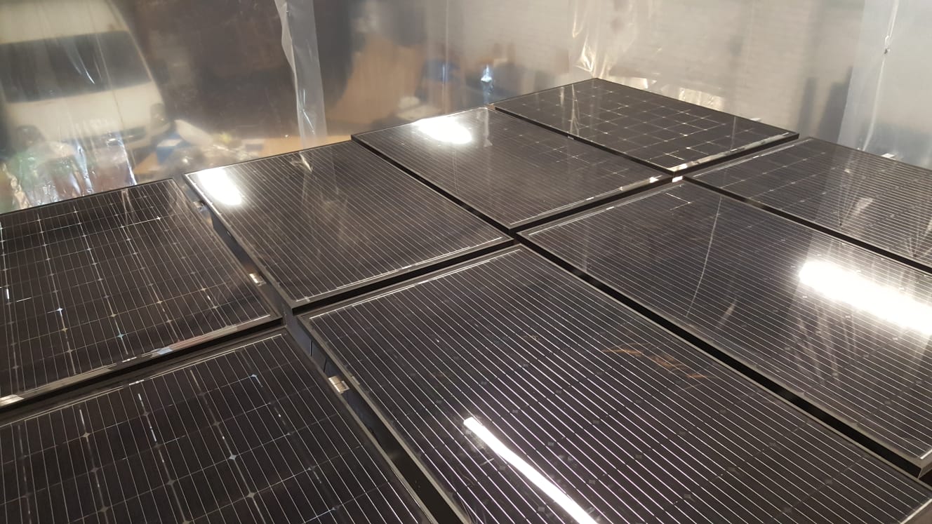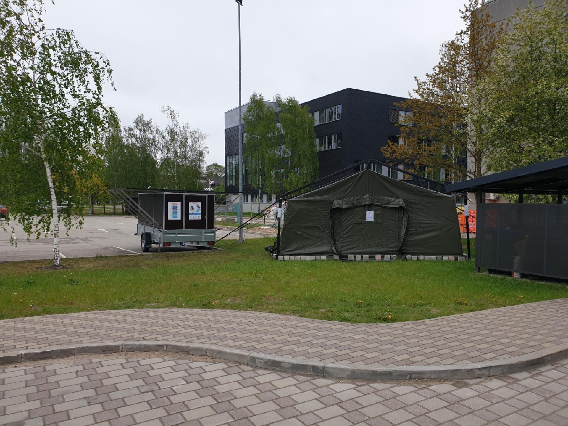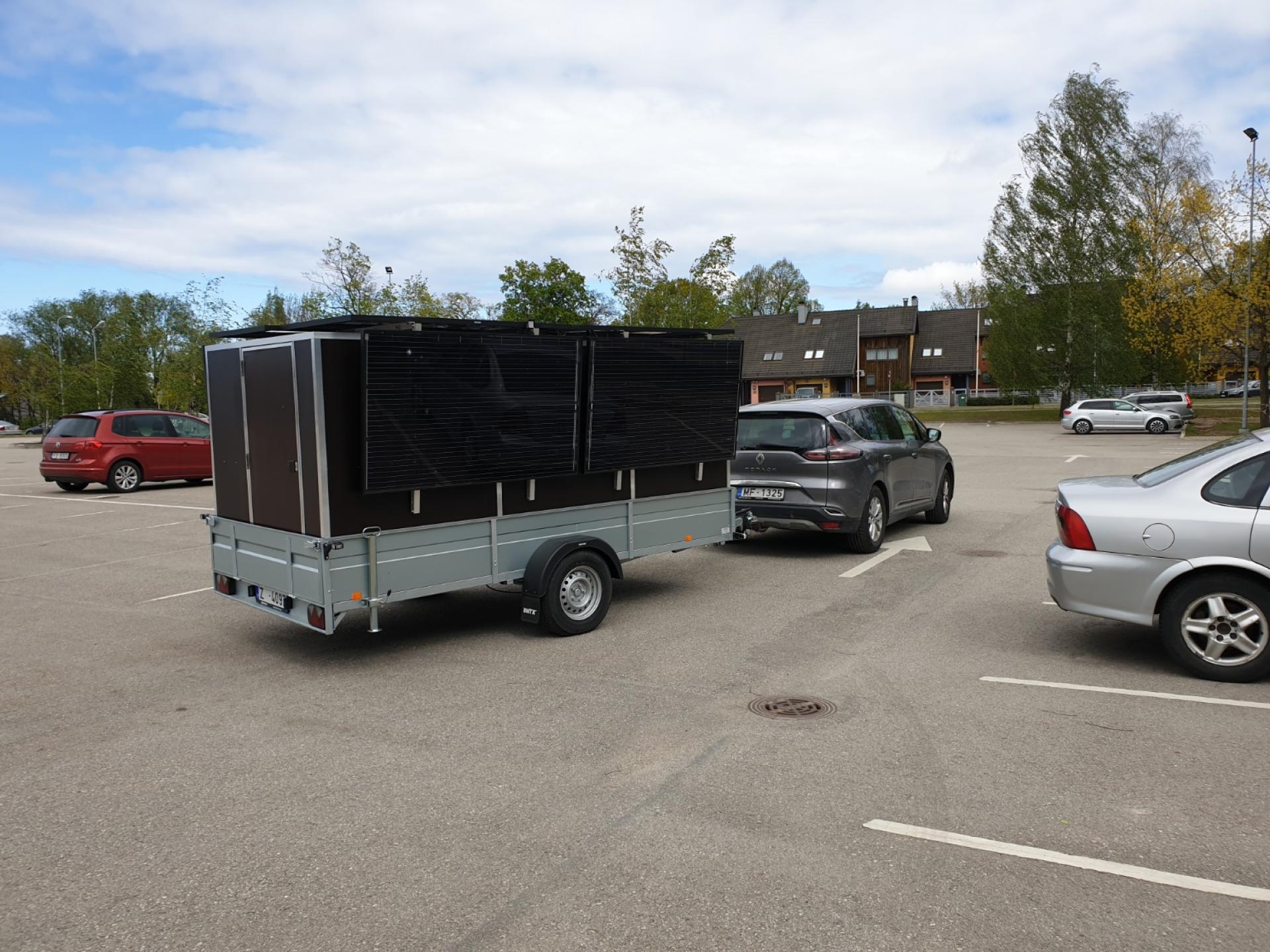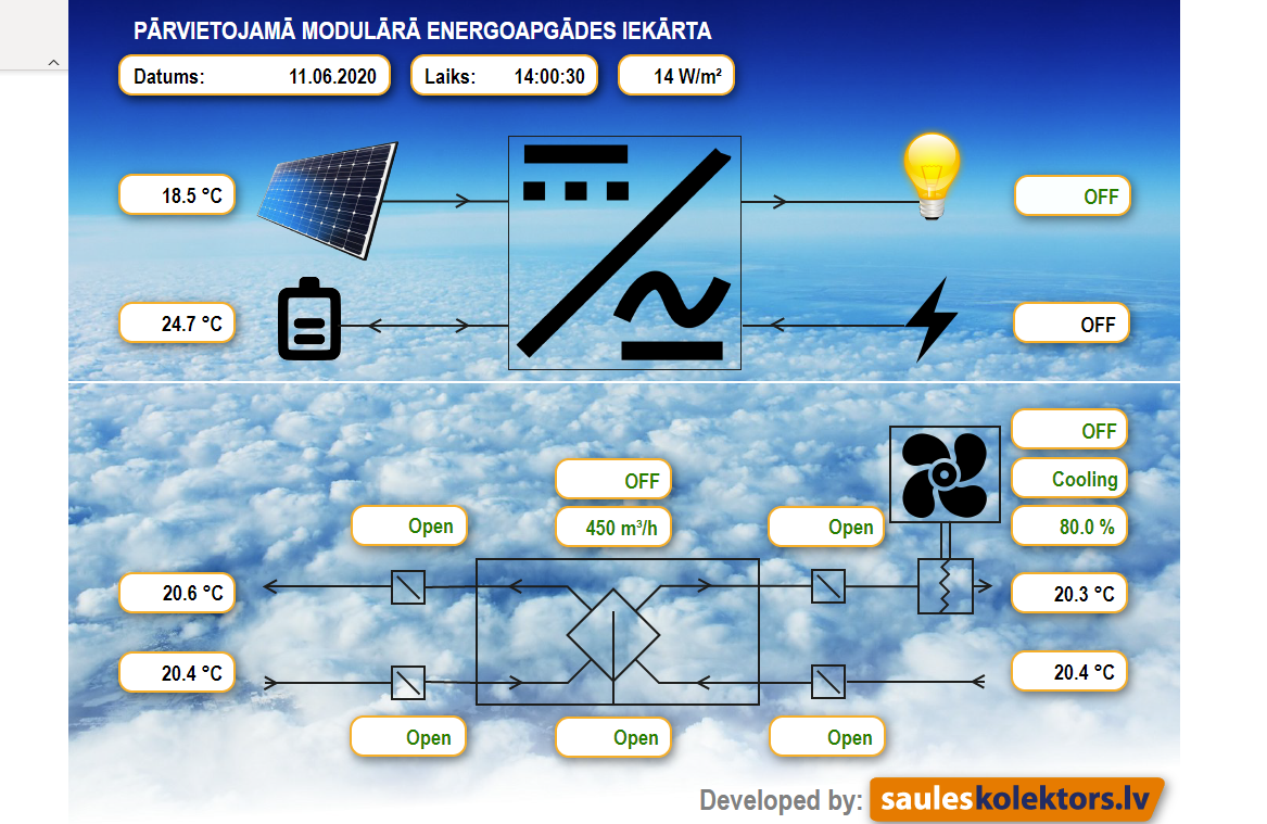 The real working modular energy unit was produced. The components of the mobile modular power supply unit are mounted in a mobile closed trailer and are protected from the external environment. The photovoltaic cell unit consisting of 8 solar panels is mounted on the roof of the trailer. 4 solar panels are mounted horizontally on the roof and 4 more panels with folding mounts on 2 panels of the trailer on the side. There is a consumers' power connector on the body of the trailer, connection to the power supply network , connection to air supply / exhaust ducts, as well as ventilation grilles for air intake and exhaust from galvanized sheet metal. Connections ensure the connection of several modules of mobile modular power supply equipment. Power generation is provided by a photovoltaic unit or a diesel generator unit. Unit is intended as a backup power source in adverse weather conditions (generated electricity - 1 phase, 230V, 50 Hz). If there is no current energy demand, the energy is stored in the energy storage unit (battery technology). Normally, the generated electricity is converted into an AC / DC inverter unit which also controls the electricity generated by the solar cells and the charging / discharging of the batteries. After conversion, the electricity is supplied by the heat supply unit (compression cycle heat pump with cooling capacity ≥8 kW, heating capacity ≥9 kW) and / or is supplied directly to the consumers to the power supply connection. Heat recovery unit provides transportation of fresh, heated air to the temporary tent via thermally insulated ducts and heat recovery from indoor warm air, which extends the autonomous life of the mobile modular power supply. The portable modular power supply is controlled by the main controller. The main controller is a freely programmable control and is equipped with an Internet modem that provides remote control.
