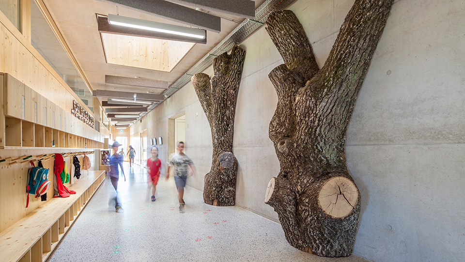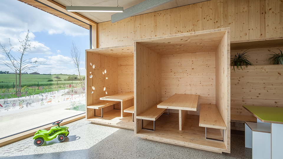 The sustainable ideas can be experienced in the children's everyday life: At one place in the building, the exterior wall is glazed to allow the children a view of the straw that keeps the building warm. The stem of a tree that previously stood on the site reminds the children of the history of the place. In carefully designed niches and boxes made of wood, the children can experience the materials first-hand.