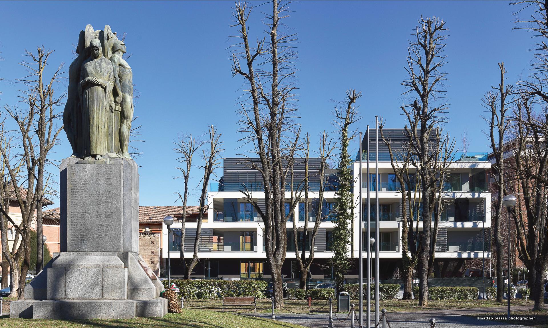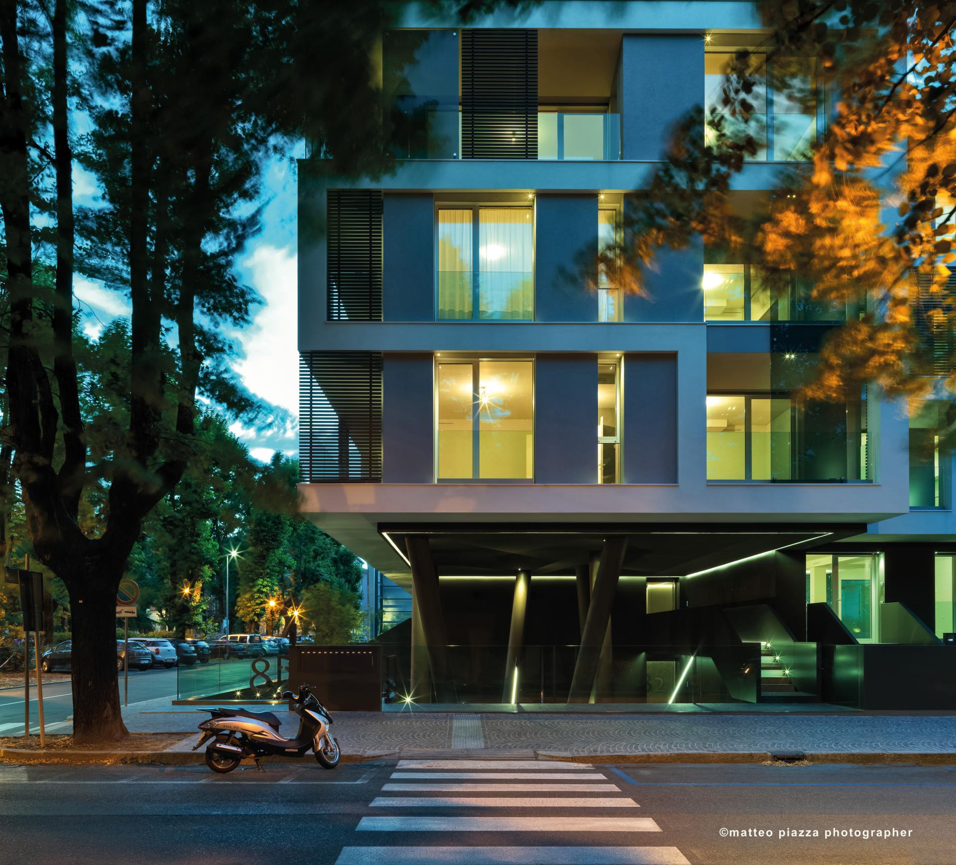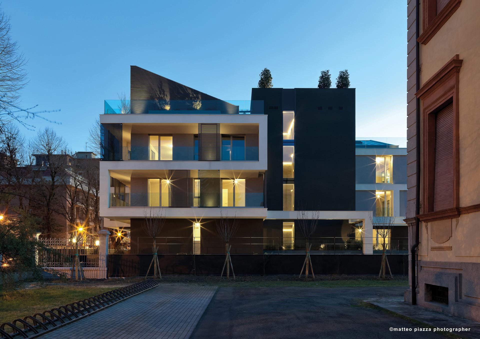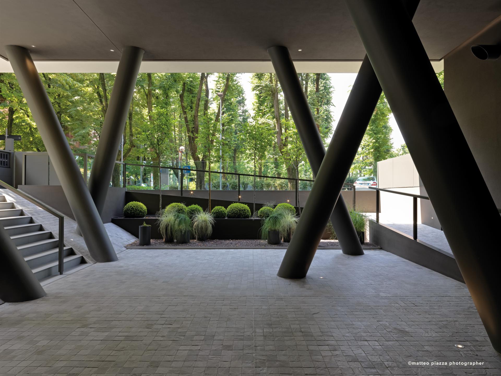 The building comprises three main volumes of different heights surrounding the central core. The staggered cantilevered balconies create wide open spaces set to be the hanging gardens where the private greenery merge ideally with the near public park. The cantilevered slabs contribute to mitigate the solar exposure in the summer days reducing the energy consumption. The large lobby entrance has been designed to be an "interspace" between the private area and the public realm, a covered "piazza" part of the urban fabric.