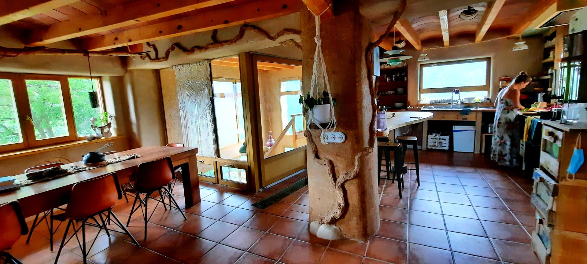 Cal Guerxo includes a number of design features intended for human delight only. The rainwater, prior to entering the water tanks runs inside a canal in the kitchen floor filled with local river stones leading to a deeper connection with water on rainy days. The sunspace provides large windows on the south-west side corner of the house, elevating the connection with the surrounding mountains to a spiritual experience of beauty.