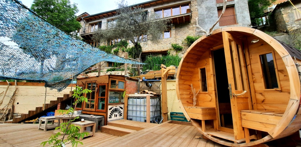 The outdoor spaces consist of a mixed mosaic of spaces integrating the beauty of the surrounding landscape through the use of natural materials such as wood and stone in combination with a large variety of vegetation that invites a large number of non-human living beings to share this place. The presence of a living organic pool (including a frog-staircase), an outdoor sauna and a fire-circle allows for shared outdoor experiences of beauty and wellbeing, while a series of secluded spaces allow for reading or contemplating while smelling aromatic plants, watch butterflies and dragonflies and listen to the serenades of the rossignol bird.