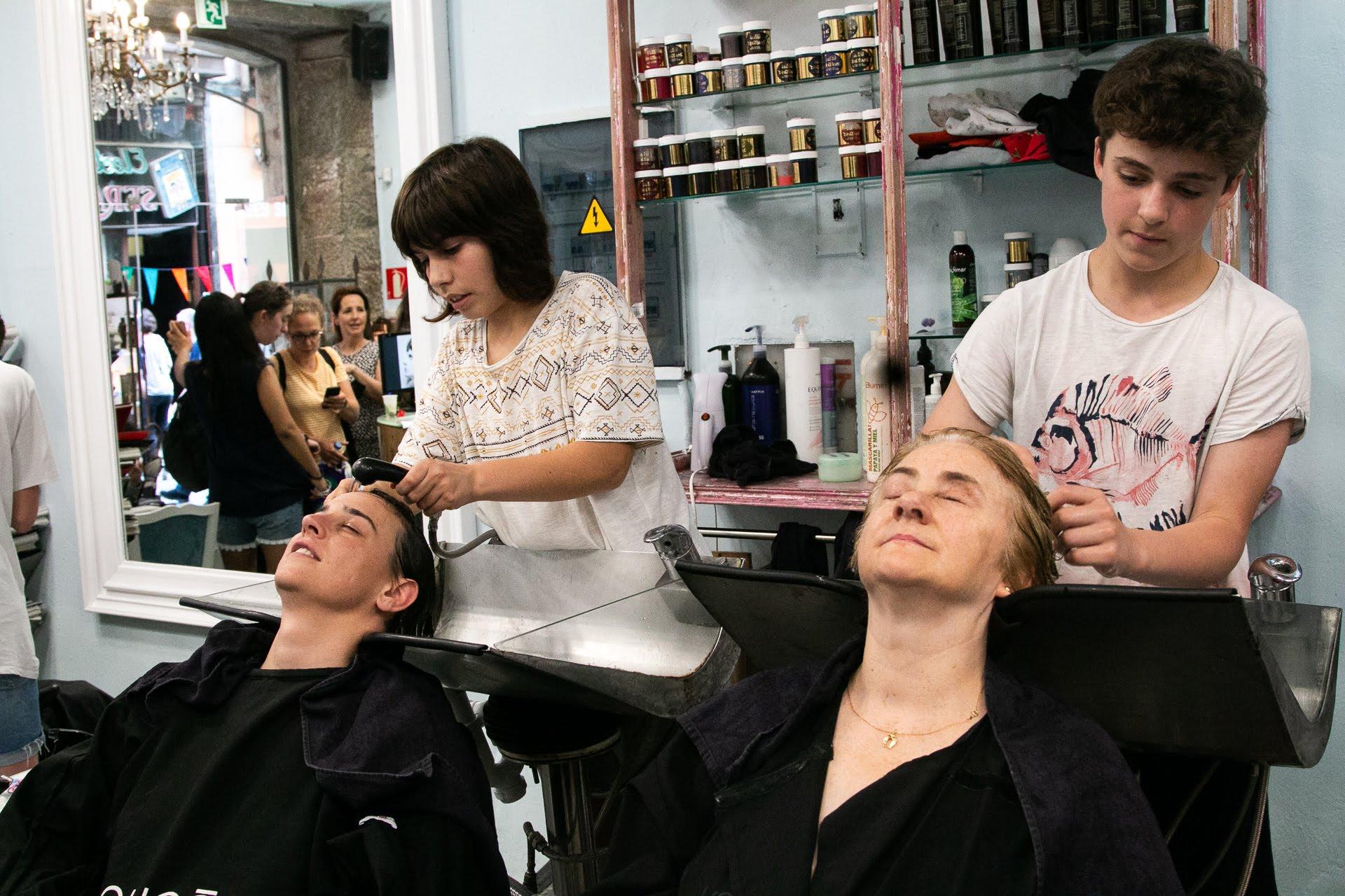 HAIRCUTS BY CHILDREN: a group of teenagers from secondary school learnt how to cut hair guided by a professional hairdresser. Then, for two days the children took over and run a real local salon where they offered free haircuts to any adults who were prepared to put themselves in their hands. This was a trust proof on the next generation.