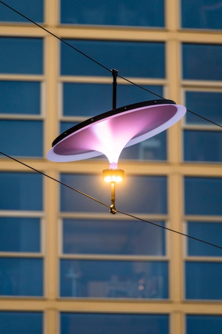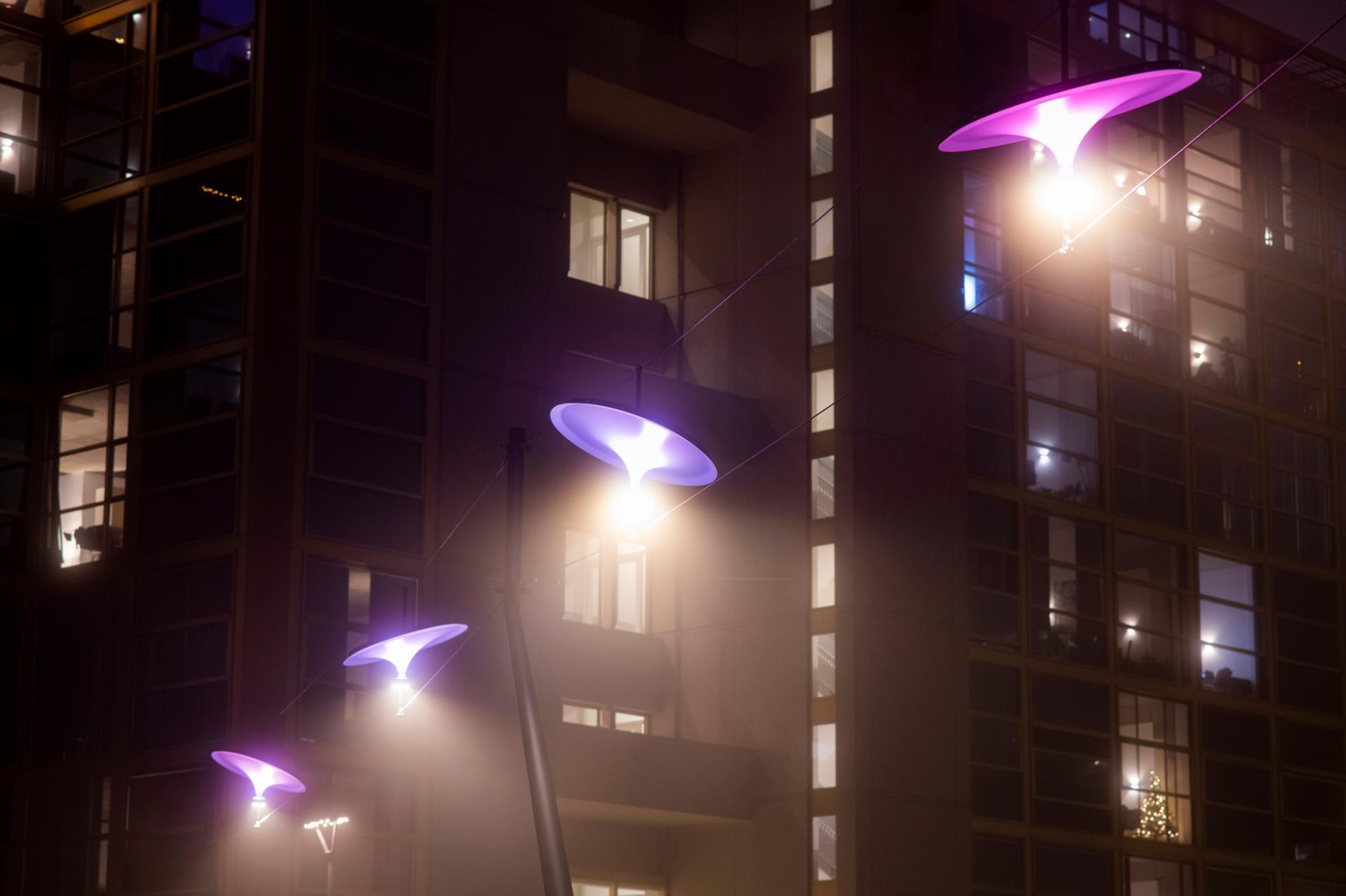 We like to work in a progressive and idiosyncratic way within the world of lighting and believe in dynamic additions and interventions in public space. We use the power of design to create sustainable, smart, tactile and movable lighting that people like to surround themselves with and that has enormous potential for the future. In our designs, technology always goes hand in hand with creativity, quality and aesthetics. But not only that: we are responding to a demand that does not yet exist. With SUNSEEKER, the chain of umbrella-shaped lanterns, we provide a contemporary, sustainable and interactive answer to the static street lighting that we are familiar with. This results in an interesting field of tension: is it art? Is it street lighting? Or is it more like something in between?