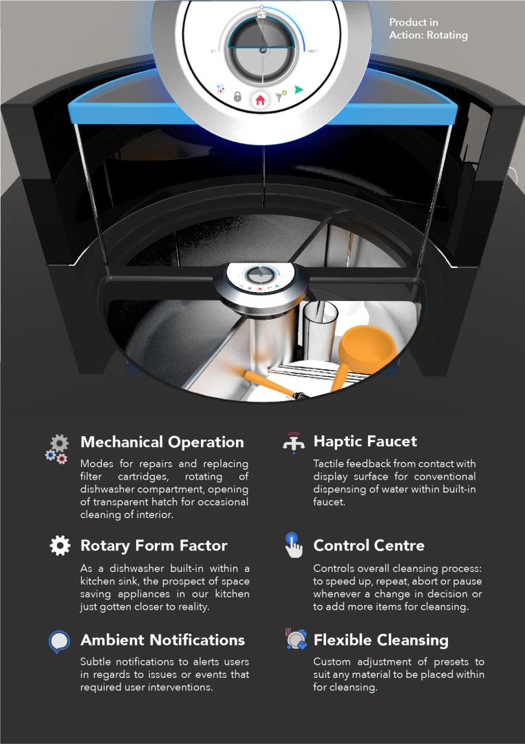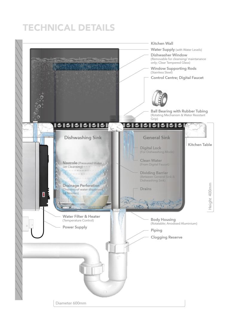 Rotating the entire basin will activate between general cleansing and dishwashing mode, dirty dishes can simply be dumped into the dishwashing module and rotated back for the cleaning cycle to begin. As a dishwasher built-in within a kitchen sink, the prospect of space saving appliances in our kitchen just gotten closer to reality.