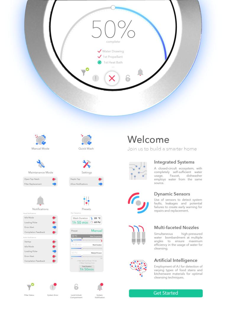 Water Usage. Indicated The amount of water used to indicate can both monitored from both Control Centre or physically from the water level present in the enclosing Water Supply structure. Within the A.I of the Control Centre, the software will scan the plates that are aplce inside the sink and determine the most effective way to get the plates cleaned (heating temperature, amount of water and time needed). This saves water, and our bills too!
