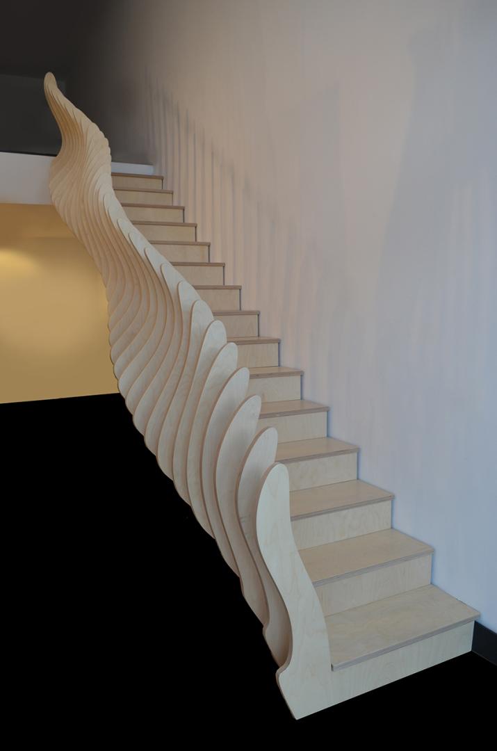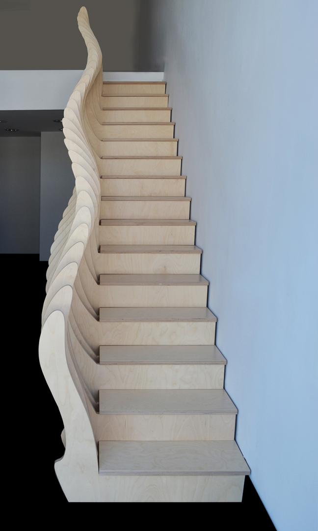 The staircase comprises of twenty-eight ornaments made of CNC cut plywood that sprout from each step and thin out gradually upwards. This construction aims at bridging the main working space with the board room in the new architecture office “Aegean Landmark” in Athens, Greece.