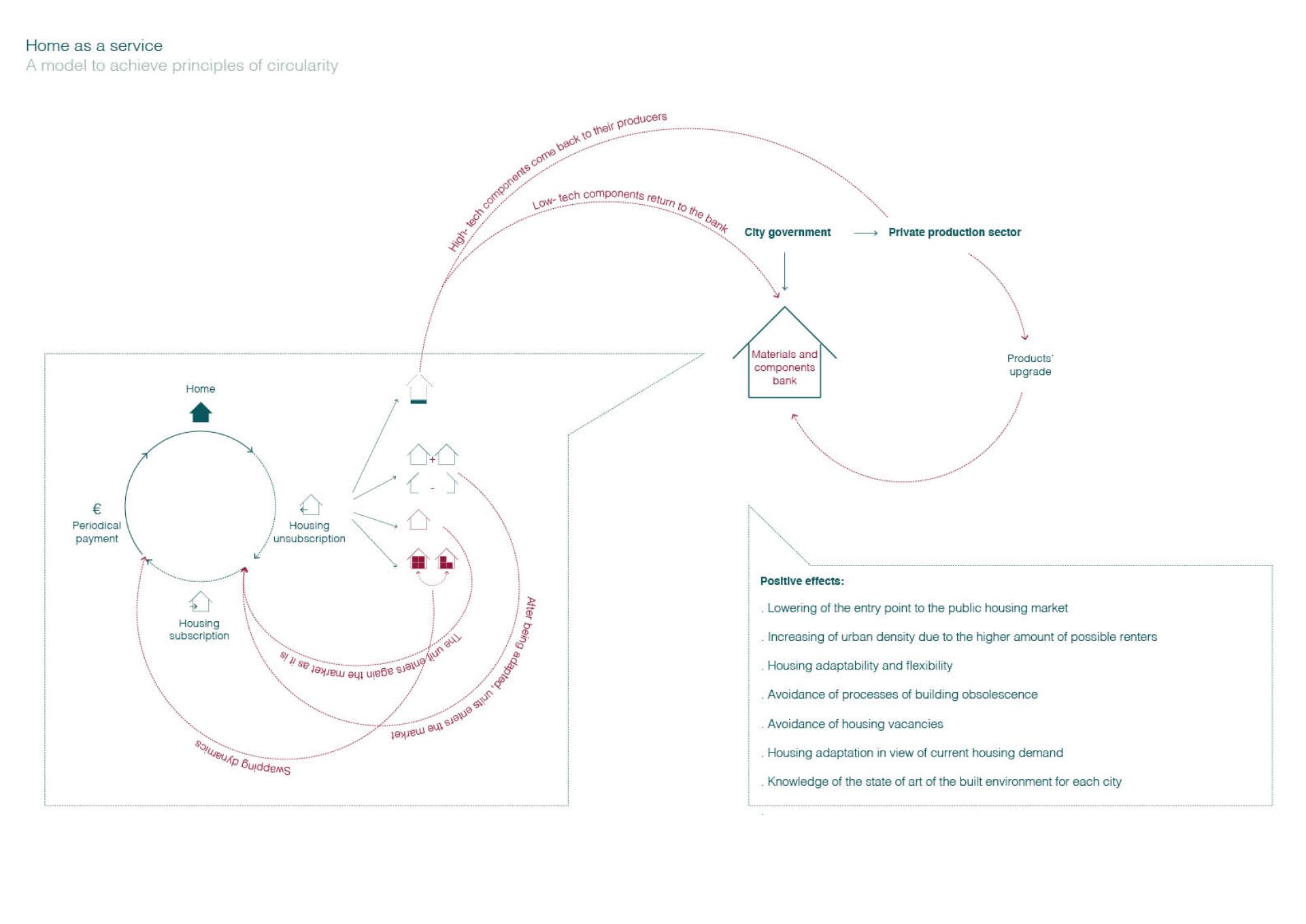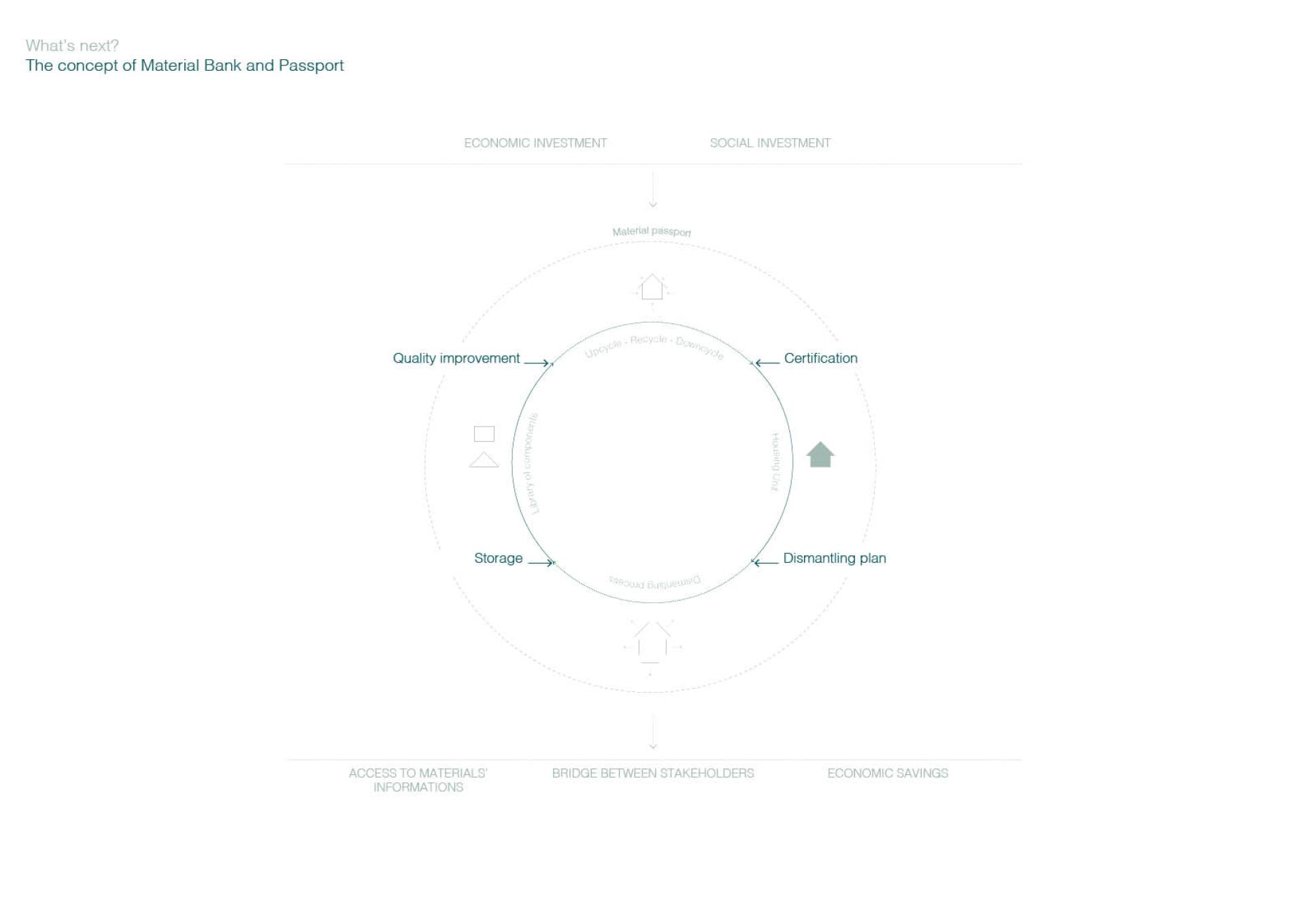 The circular financial urban system ensures, instead, the actual circularity and thus direct reuse or improvement of all the building components. A Public Material Bank reinforces the collaboration between public and private sector, helping to solve problems of maintenance and a correct passage of informations regarding components, that can be technologically improved. In this vision, the idea of components in Leasing helps to push investors to focus on a diversified investment portfolio rather than on quick turnovers. Moreover, it permits a better reply to housing demand, as cities have a better knowledge of their spatial resources and eventual vacancies.
