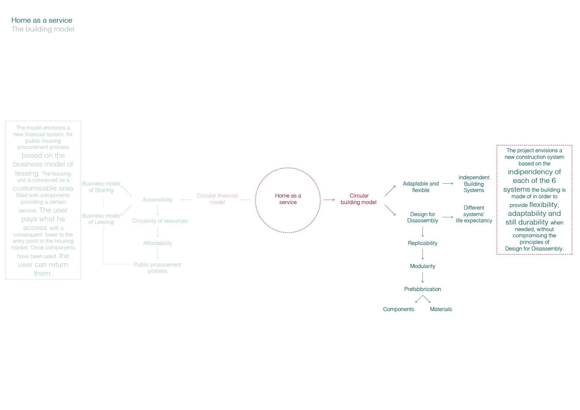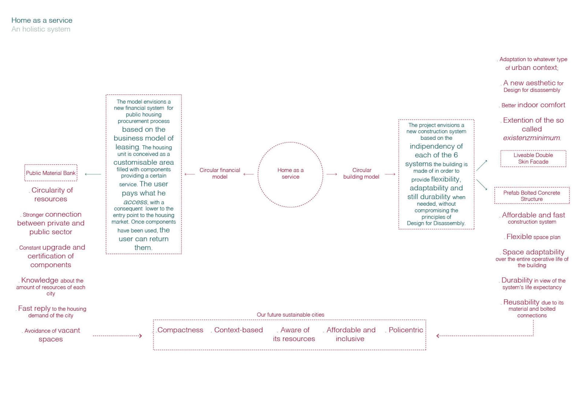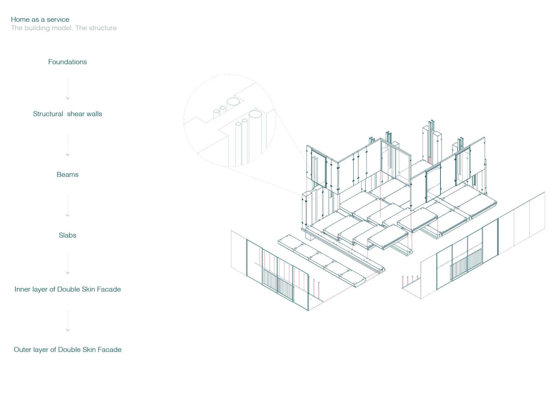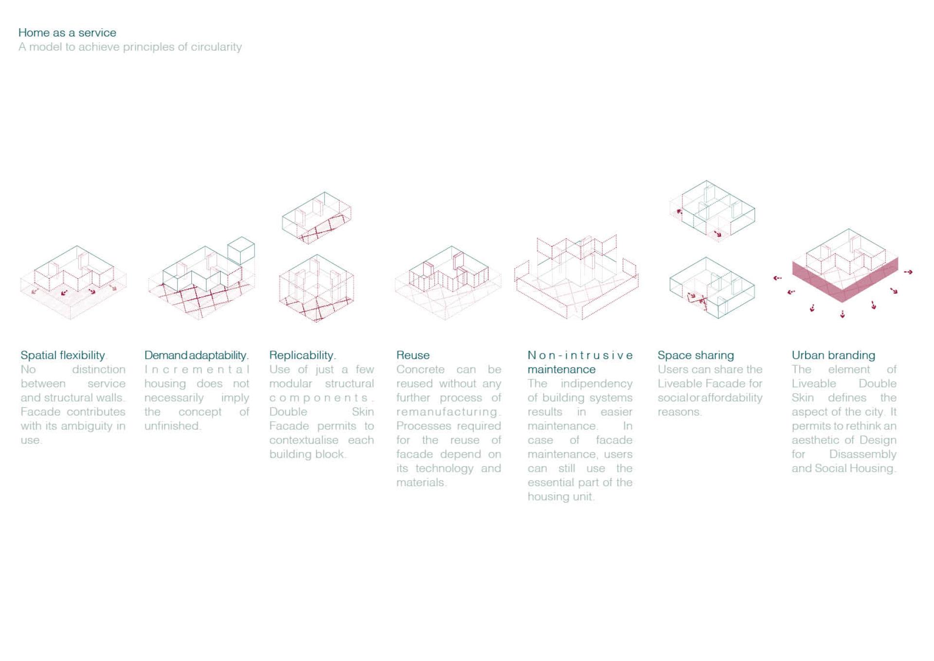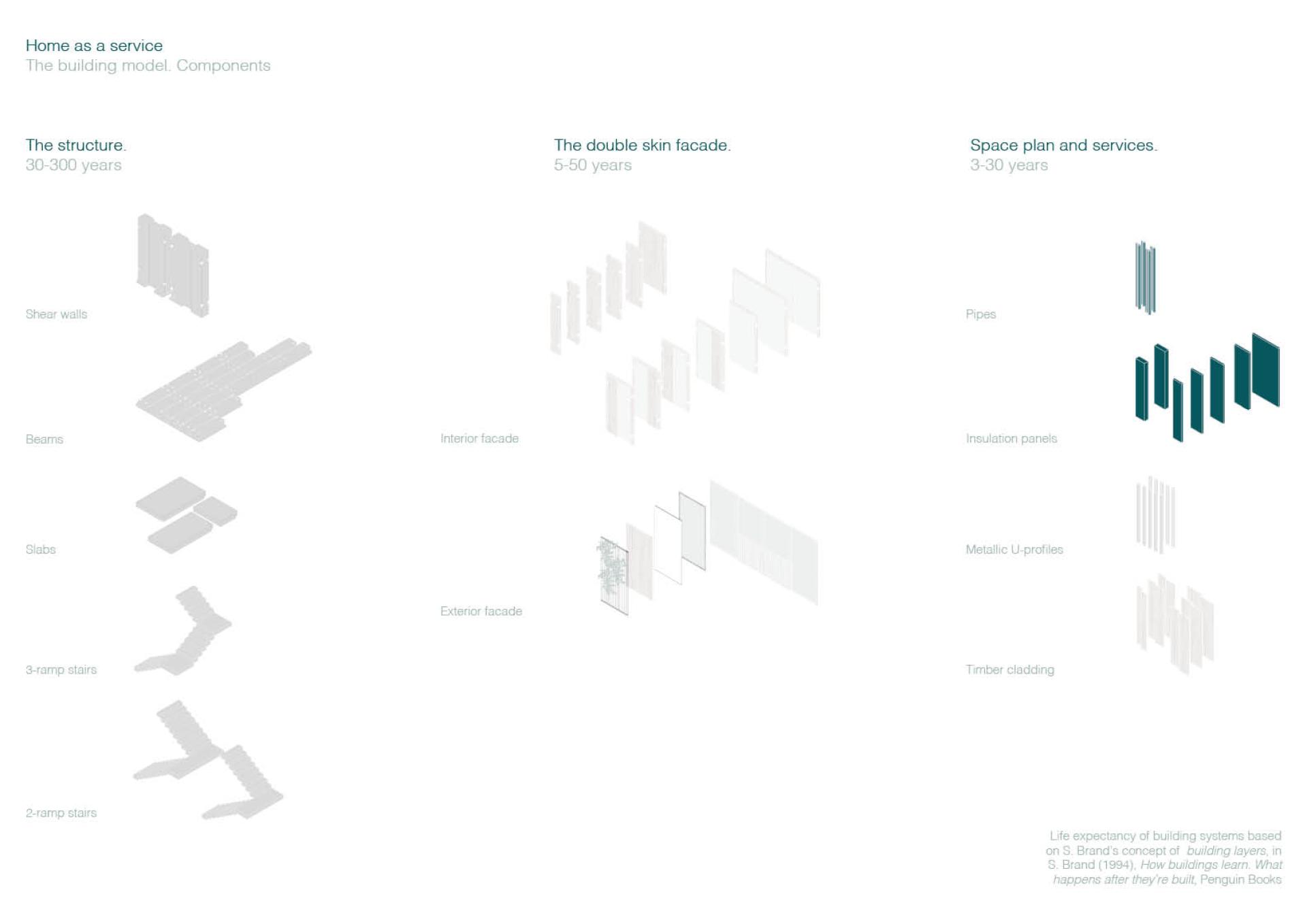 Cities are facing major challenges as rapid urbanisation, loneliness, climate change and lack of affordable housing. Thinking to an alternative way to build and inhabit our future homes is thus crucial. Therefore the project envisions: a new circular prefab and modular concrete building structural system; an independent liveable double skin facade to launch an aesthetic of design for disassembly; a new financial model based on the concept of leasing to lower the entry point to the housing market