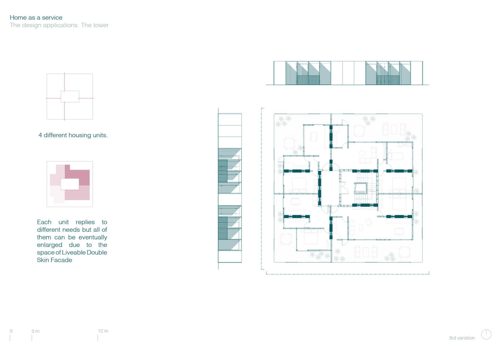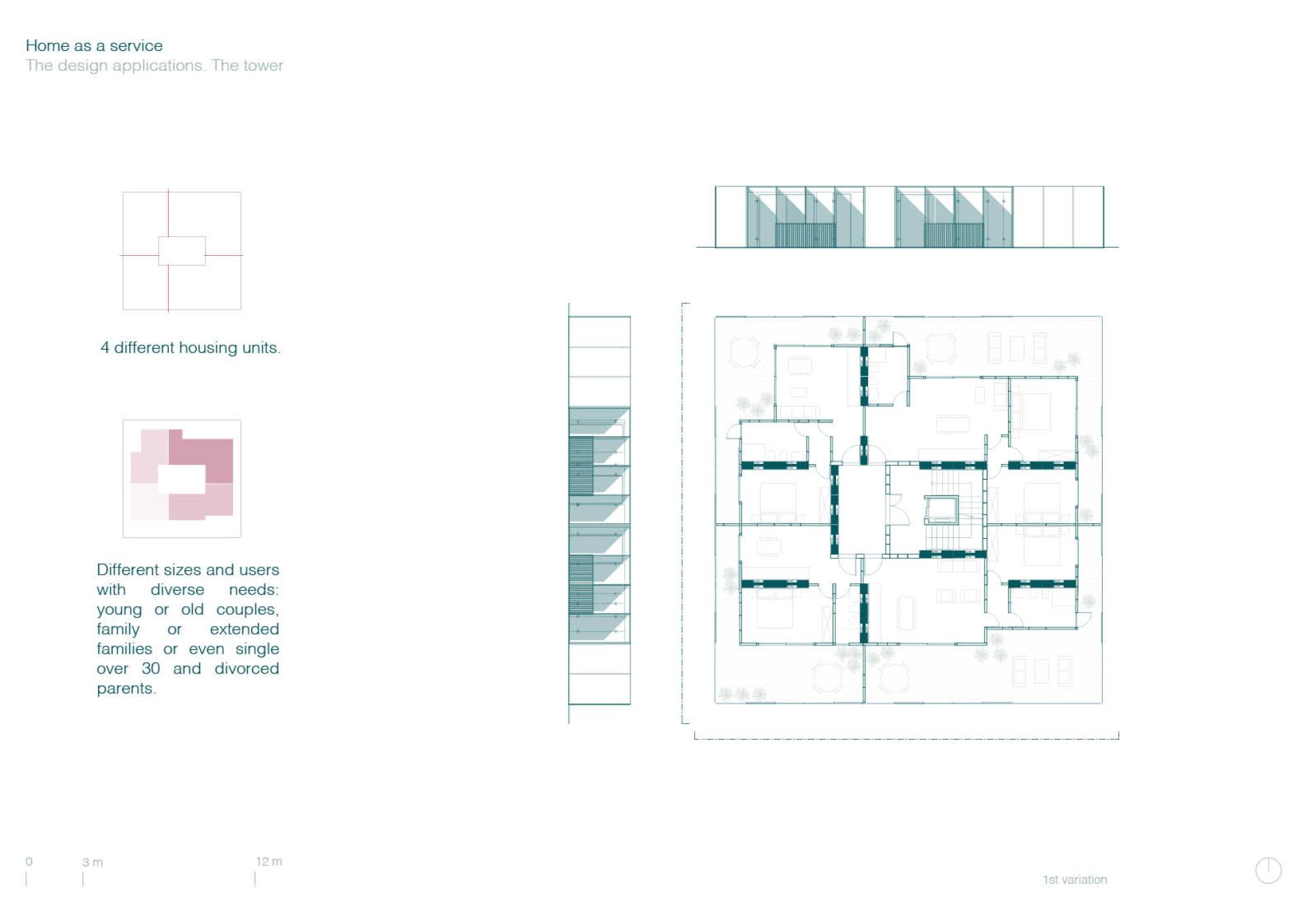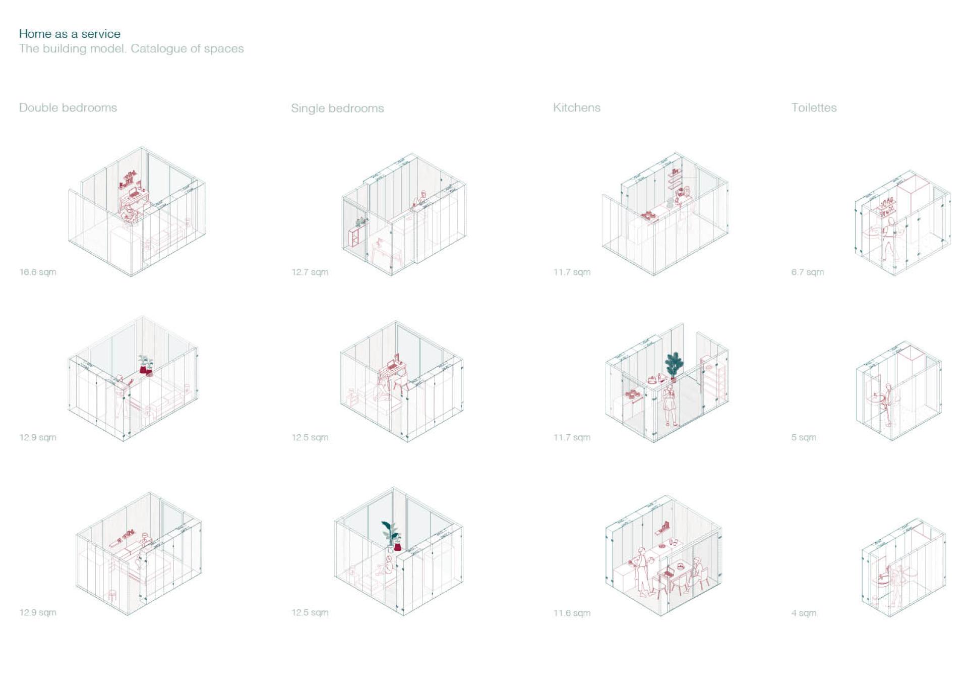 Given a fixed and permanent structure, the client entering the public housing market is asked to choose how many square meters he wants to buy. He has the possibility to decide how many services (bathroom and kitchen) to include into the apartment and where, according to the potentialities of flexibility offered by the structure.Then, finally, he can shape the rest of the spaces, through the leasing of different types of space plan components, that he could choose as from a catalogue.