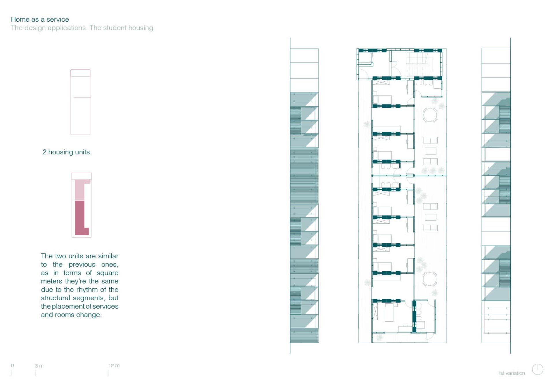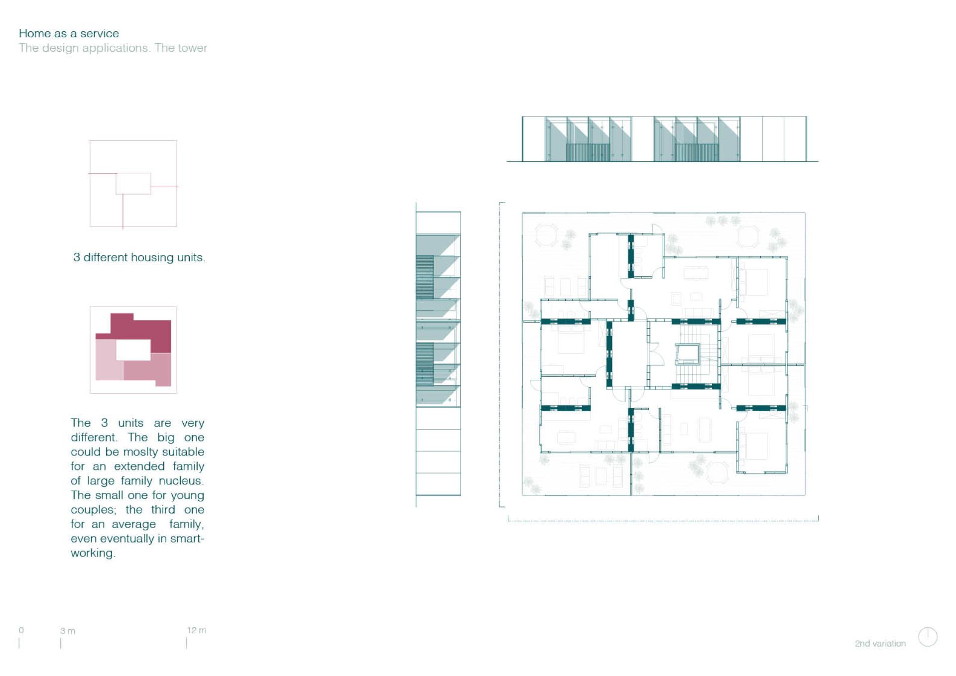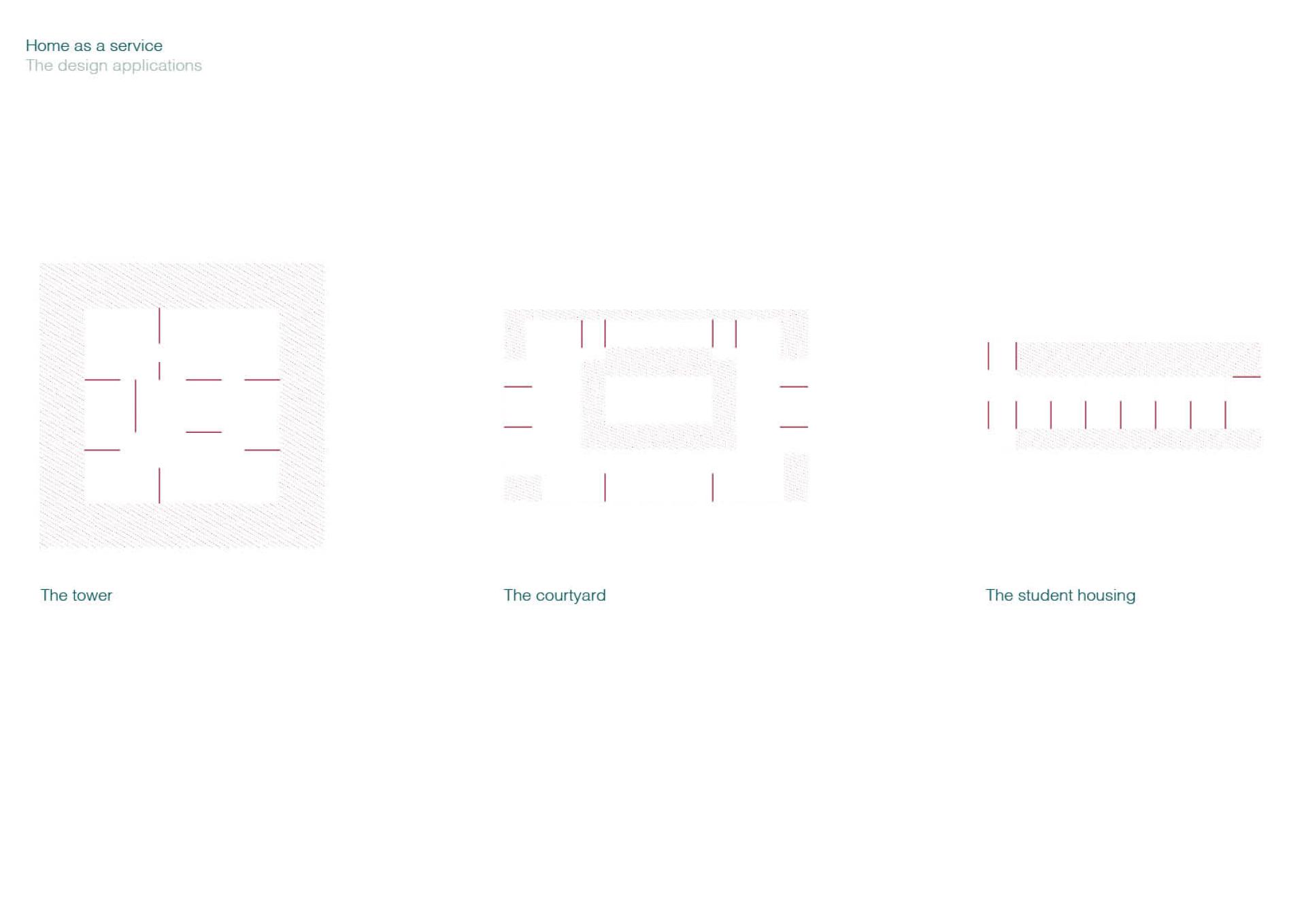 Given a fixed and permanent structure, the client entering the public housing market is asked to choose how many square meters he wants to buy. He has the possibility to decide how many services (bathroom and kitchen) to include into the apartment and where, according to the potentialities of flexibility offered by the structure.Then, finally, he can shape the rest of the spaces, through the leasing of different types of space plan components, that he could choose as from a catalogue.