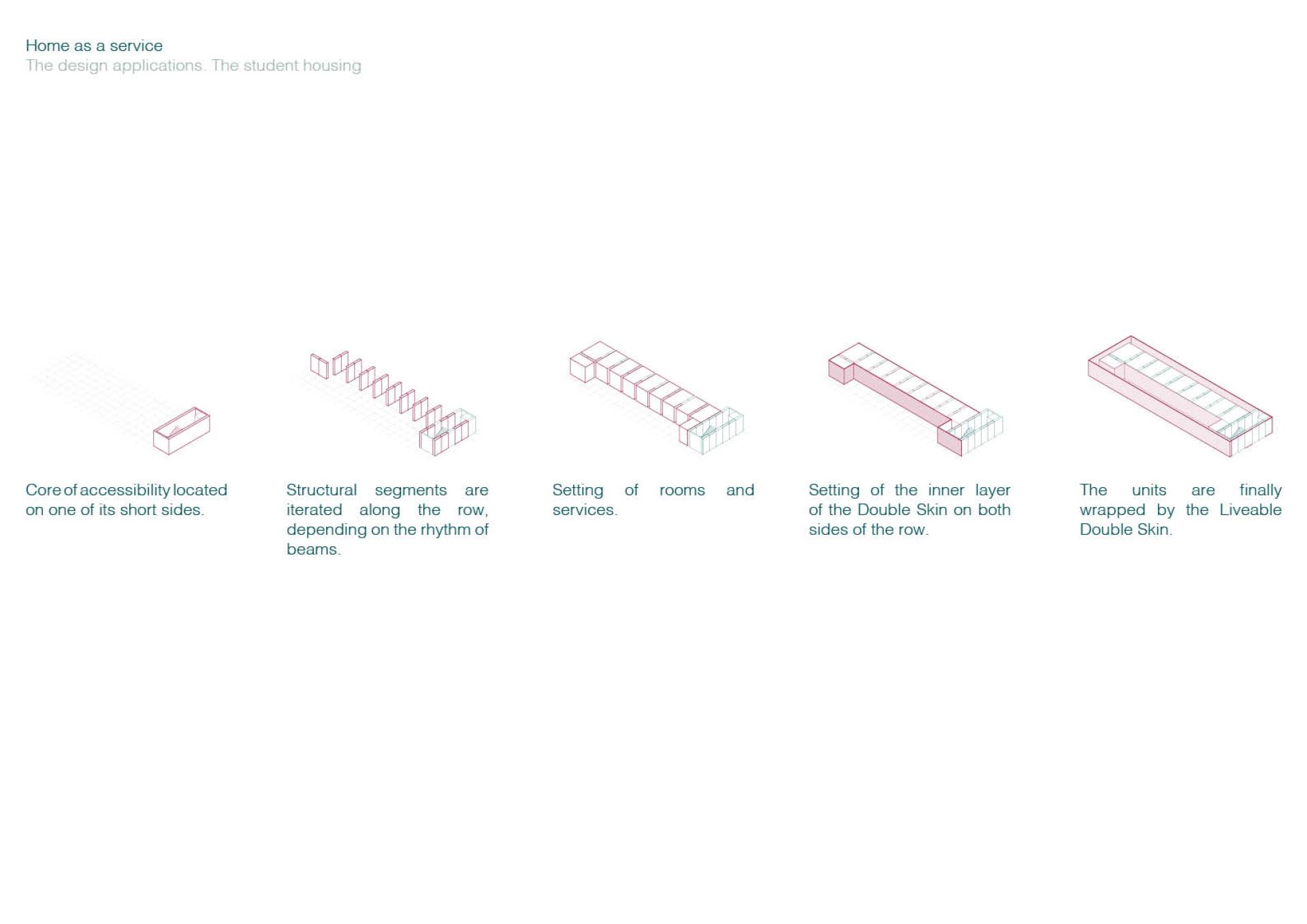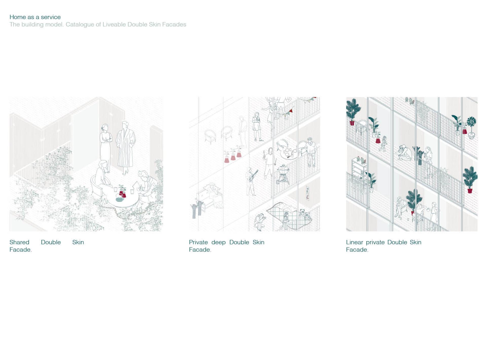 The objective is thus to provide an elegant and performative aesthetic for Design for Disassembly and Social Housing. Thanks to the element of the independent and liveable double skin facade, the aesthetic of each building block can be renovated each time, depending on the urban context the project need to fit and on the technologies municipalities and private industries decide to apply. This feature would implement the experience of the user, that would live a customised inside/outside space, always different, in terms of aesthetic and indoor comfort. Prefabrication wouldn't correspond anymore to standardisation. Moreover, the independent liveable double skin facade could improve the urban quality of entire peripheral segments of city, becoming in this way catchy and attractive, in the framework of a wider idea of policentric city.