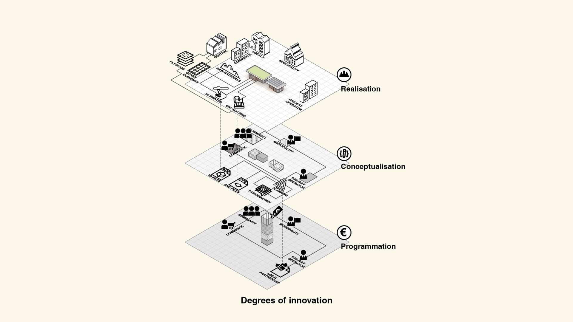 The innovative character of Custom Station can be summarized in advancing mass-customization into mass-localization for the construction of new railway infrastructure. Instead of centralizing the production of building components as done in a traditional prefabrication scheme, a series of new fabrication processes can be intertwined, to allow for a rail-bound, mobile method of building train stations and similar structures. As described above, this innovative approach towards the way we build will bring significant environmental and social benefits for multiple reasons.
