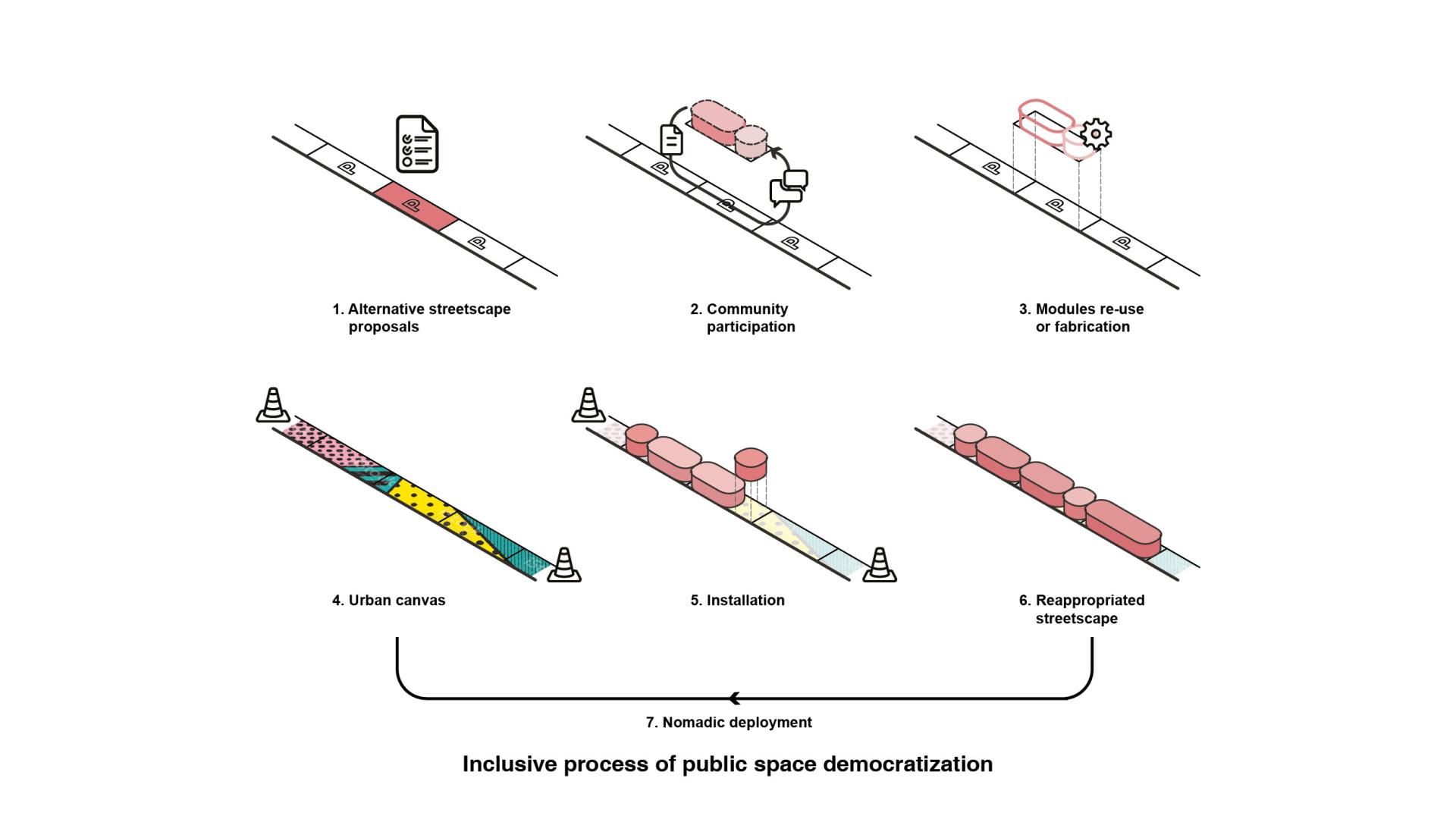 In this context, a new type of urban intervention emerges; those aimed at reallocating parking spots to public space designed for/by people. Often, these interventions are received skeptically by institutions as they are assumed to be time intensive to implement or not scalable. The process we propose is to combine the scale of centralized planning, with parametric geo-localized analysis, with the scope of citizen participation, by inviting citizens to be part of the shaping of public space starting at their doorstep.
