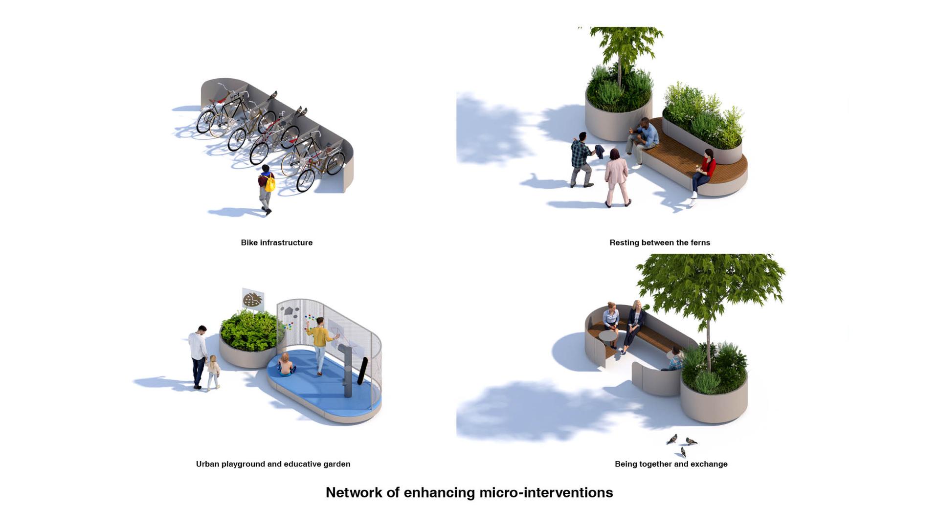 The proposal aims to reclaim public space, change mobility patterns, reintroduction of vegetation, not in a “big plans” modernist approach but in a distributed constellation of micro interventions.