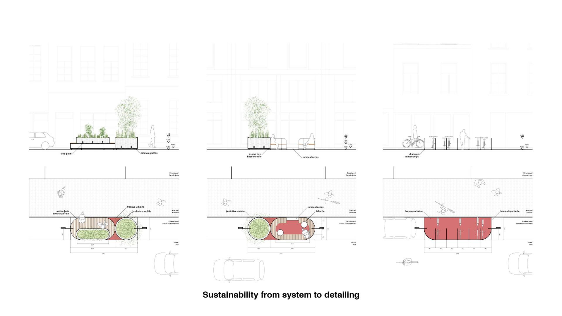 In each neighborhood, the implementation of the intervention needs to be embedded into the existing social and civic fabrics. The floor onto the succession of modules are placed, once car parking spots, becomes a canvas onto which communities are asked to creatively express their vision of their street. Children living in this street, local artists, nearby school, neighbor association, can project on this urban canvas an extension of their social values and aspirations.