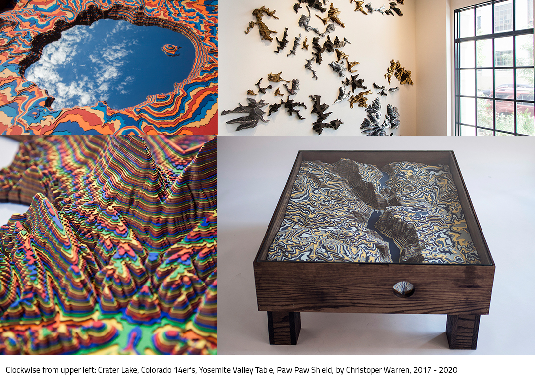 That said, CONTOURS is more innovative still in its interdisciplinary approach. While this proposal is presented by Michael Salka, whose expertise in ecology, carbon/energy accounting, 0km timber, digital fabrication, project management, computational and collaborative architectural/urban design has been referenced in the preceding sections, CONTOURS actually represents a collaboration between three innovators aged 30 or under: Michael, age 30, is supported by Kunal Chadha, age 29, an IAAC colleague expert in technology, robotics, digital fabrication and computational design specialised in 3D printing earth; and Christopher Warren, age 30, a visual artist represented by Walker Fine Art expert in 3D sculpture, large-scale murals, digital fabrication and manipulated topographic/cartographic landscapes specialised in contoured, layer-based representations.