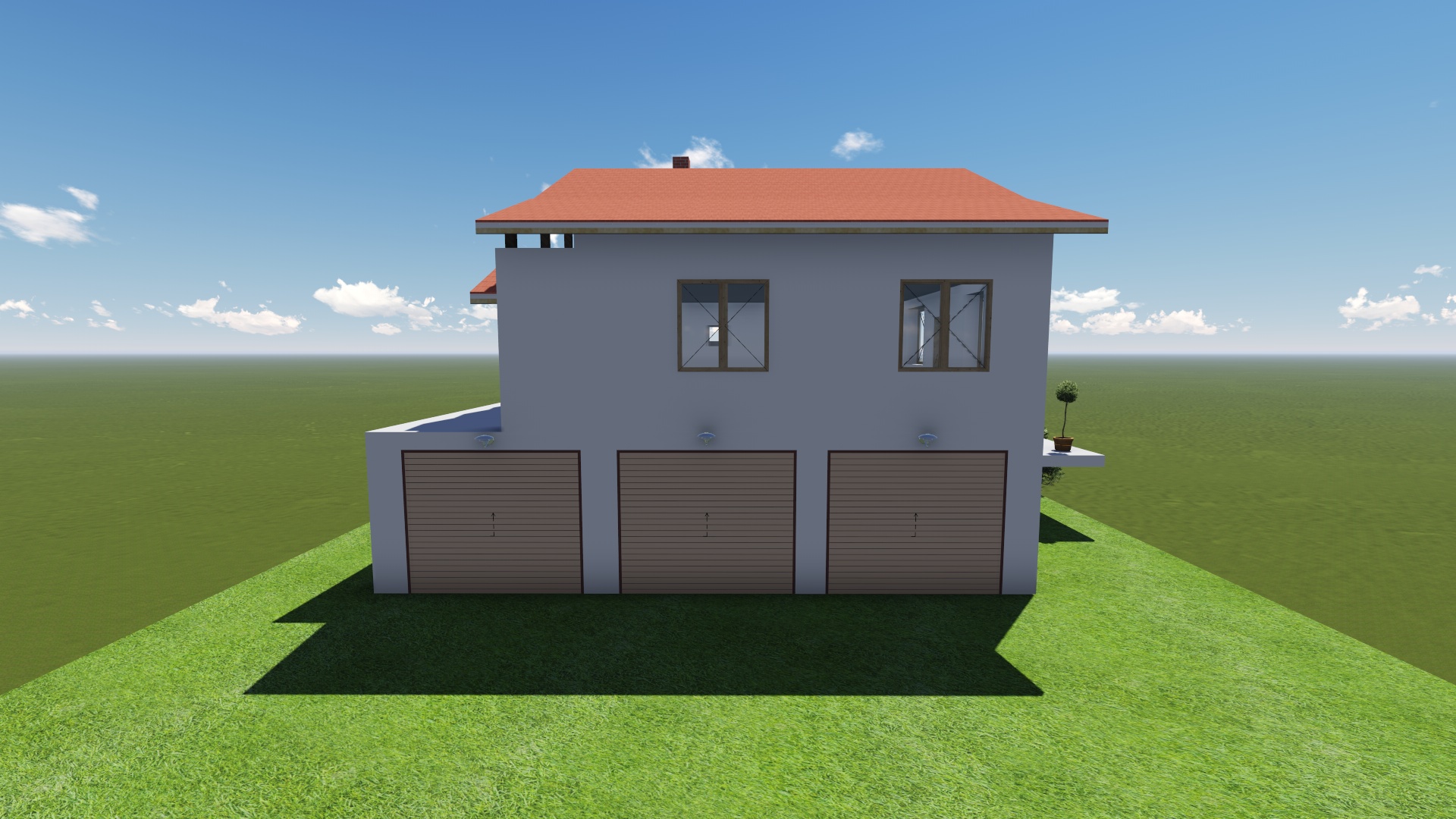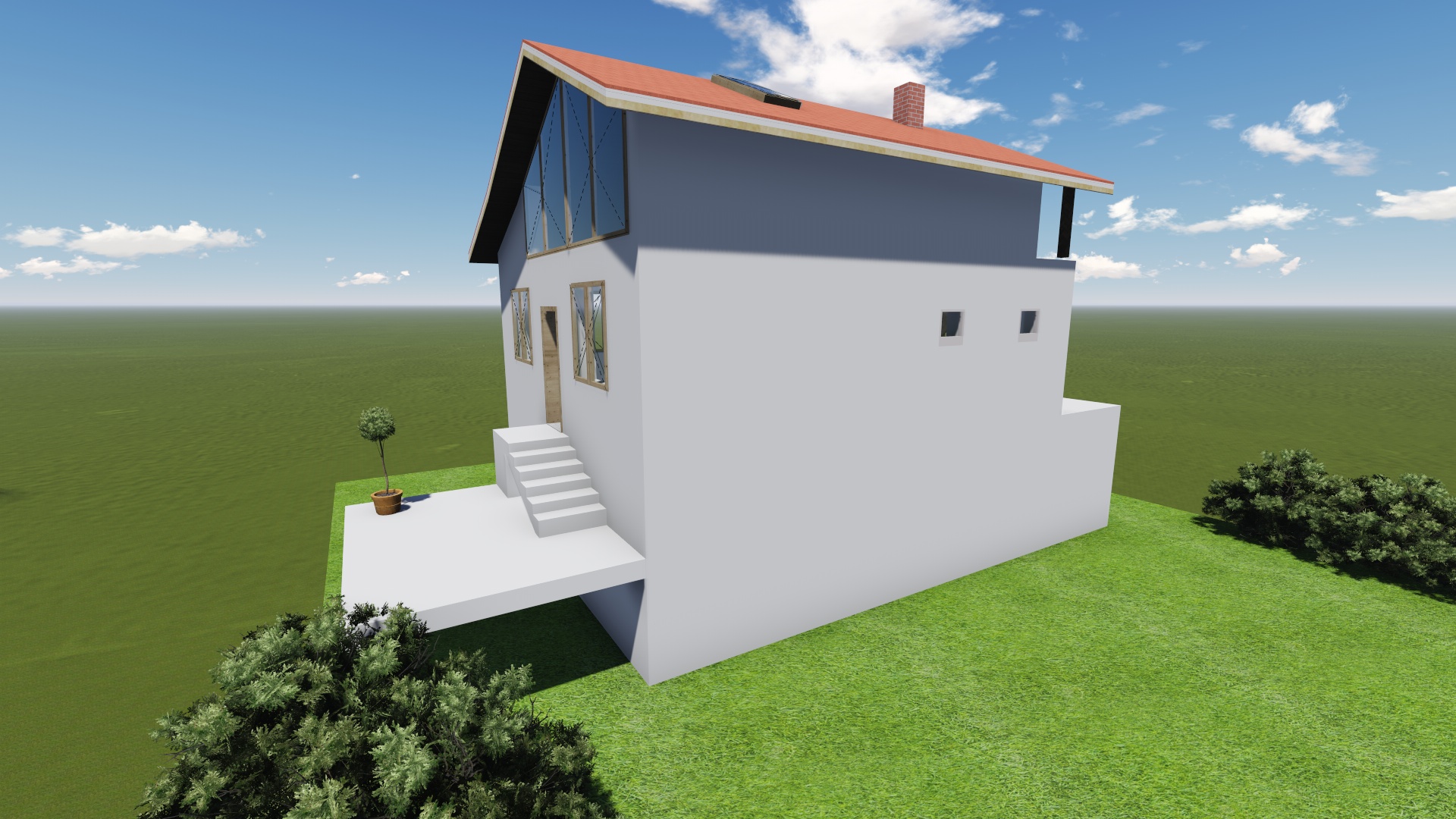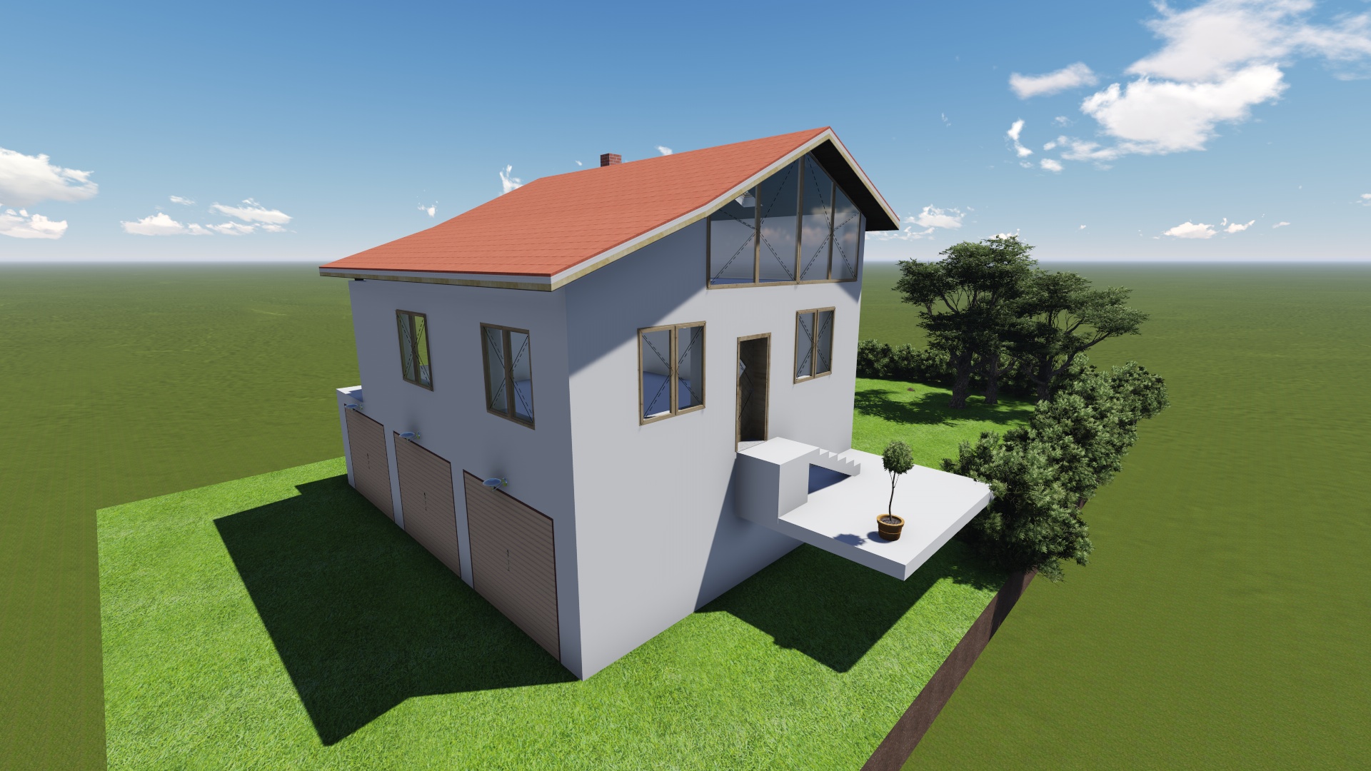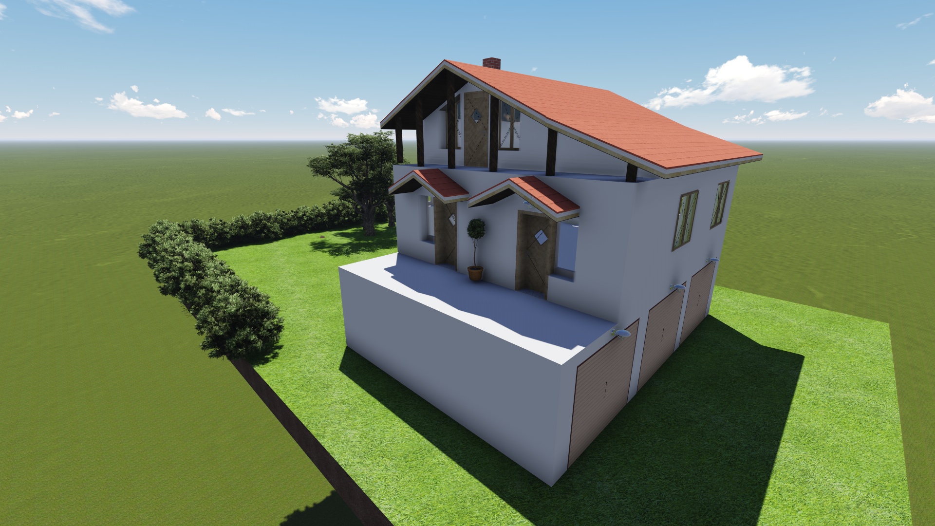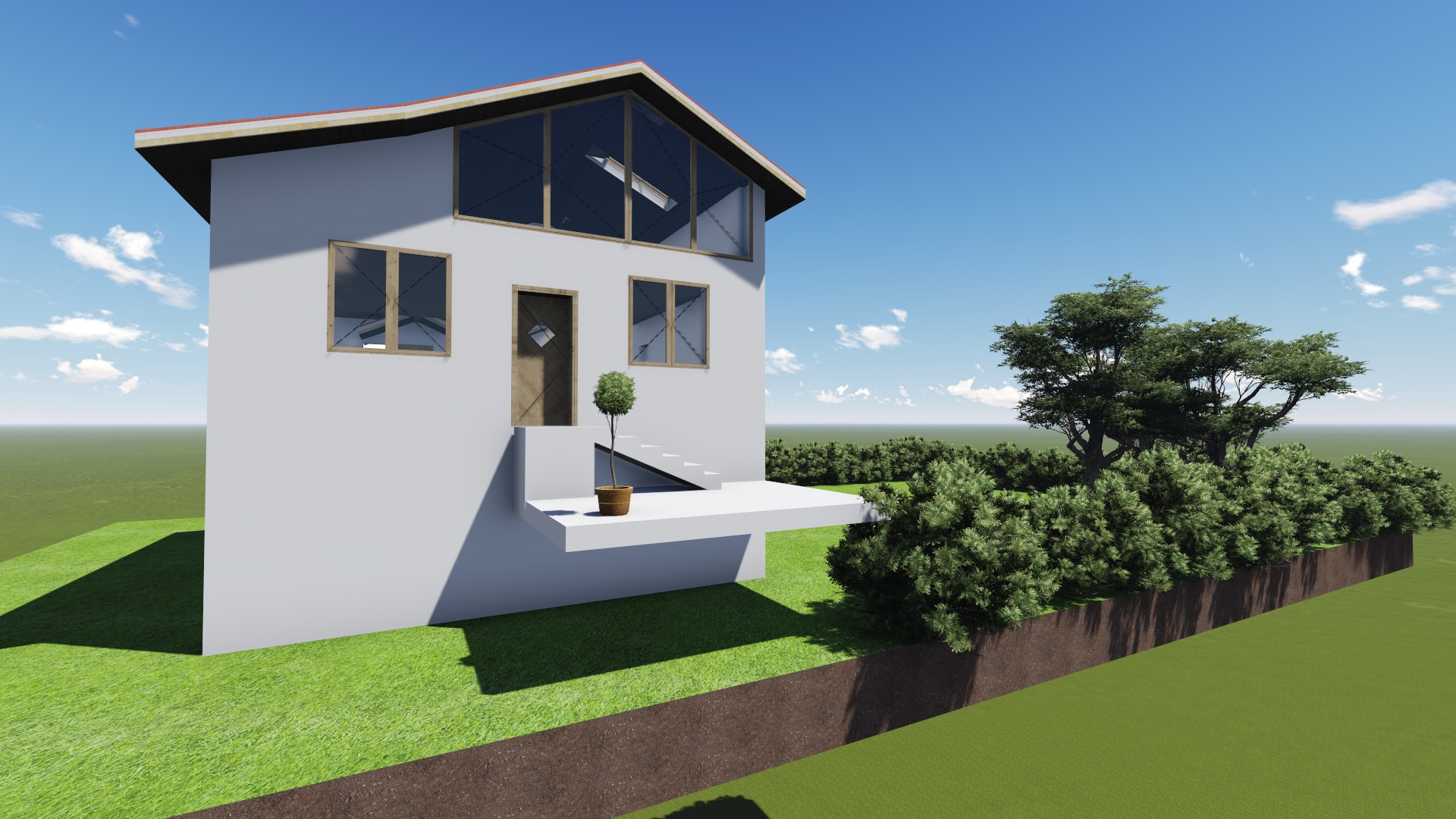 At the level of the concrete slab on the second floor, on the west side of the house, will reach a garden area in which fruit trees and various crops are planted. The garden is not depicted because the workshop is not clear how much space it will take.