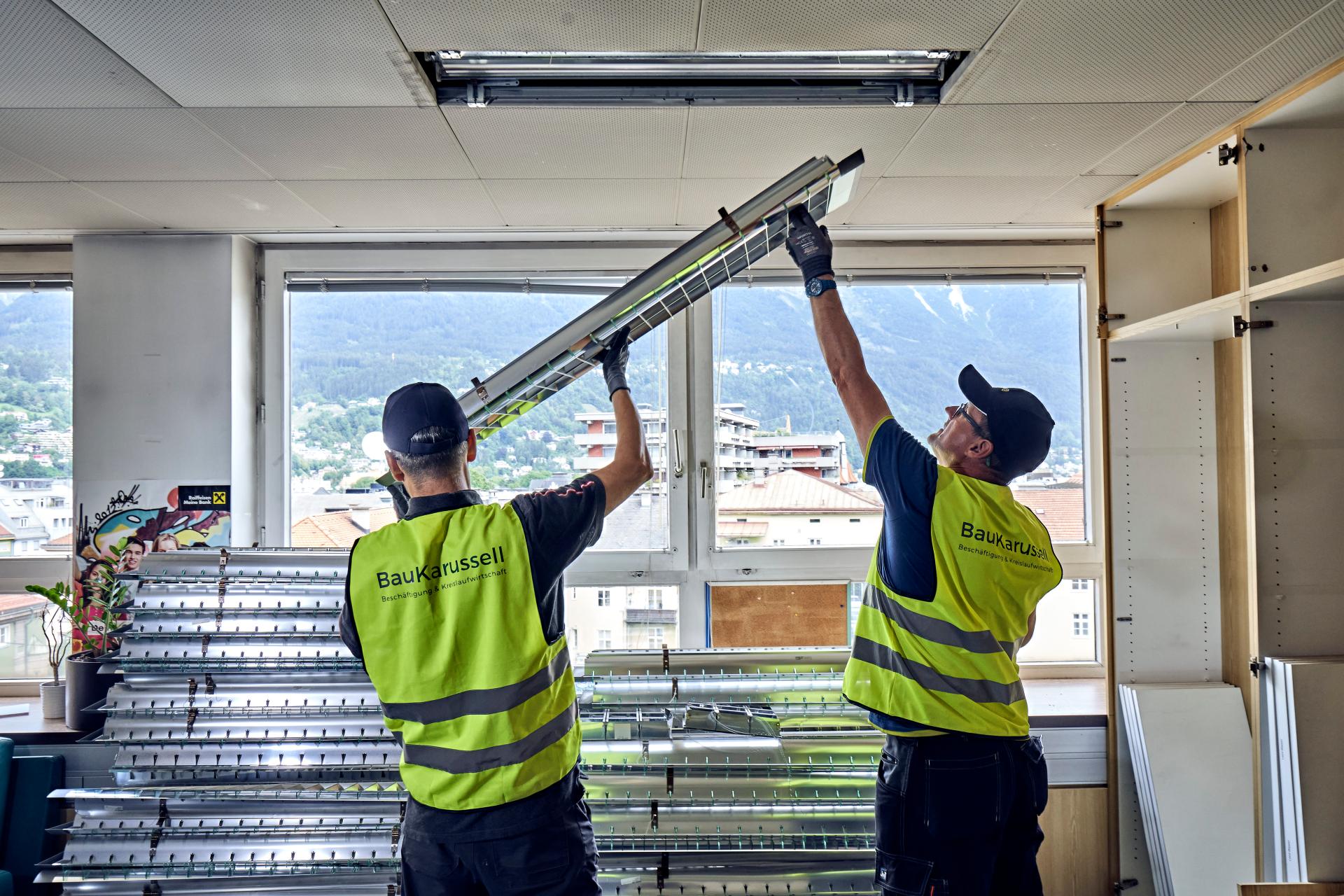 This project is one of its kind in western Austria. First of all, the "Social Urban Mining" has never been done on a big project like this, where over 50 people worked on the recycling of a whole office building. Usable parts and furniture were sold and given away, ranging from fine wooden tables to tiles from a massive indoor glass-bridge. The dismantling was done by our social partners who not only pre-sorted recyclable materials which increases the price for which they can be sold but also did part of the removal of the problematic substances (AMF's, fluorescent tubes).