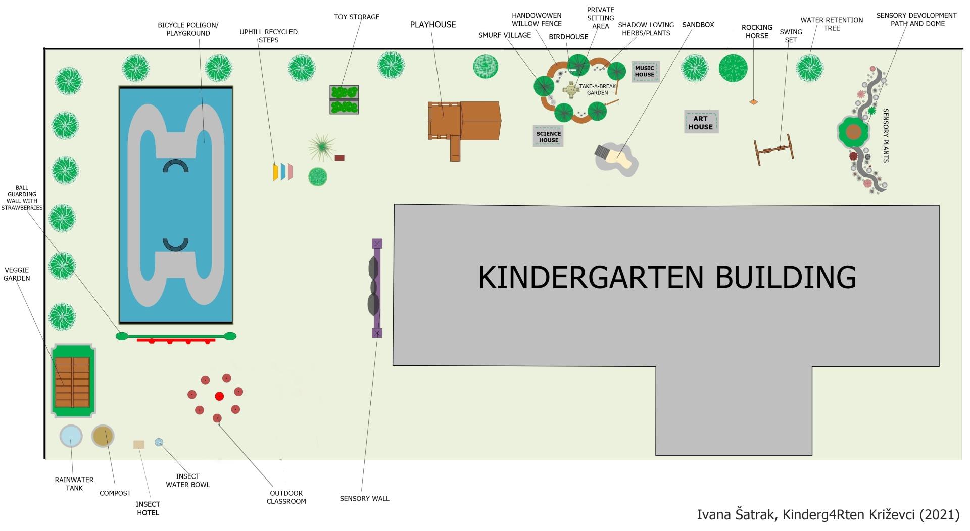 Design represents the aesthetic and functional renovation of the Kindergarten yard in City of Križevci. The yard is designed as a multifunctional zero waste green space where children will spend time playing and learning with their peers and kindergarten staff. Design is done with existing trees in mind, but also adding many new trees, different plants and shrubs which will play a very important role in combating the summer heat and rain flooding which has been an issue so far and made the yard unusable for children. All plants used will be safe for children and/or edible. Intertwined with the green space, objects and contents inside of it will be based on the 4R principle (reduce,reuse,recycle,restore= and provide a sensory and educational benefits for children, creating a connection with nature and providing a child accessible green haven in urban setting. Theme houses (art, music, science, toy storage) will have a green roof to make them cooler in the warmer weather and will contain educational contents, supplies and toys keeping in mind natural materials and 4R principles. A veggie garden with raised beds will create an opportunity to create awareness of ‘where food comes from’ and establish healthy relationship with food. The bicycle polygon and sports area will create a safe place to learn traffic culture, but also be a place to play different sports and create healthy habits from young age.