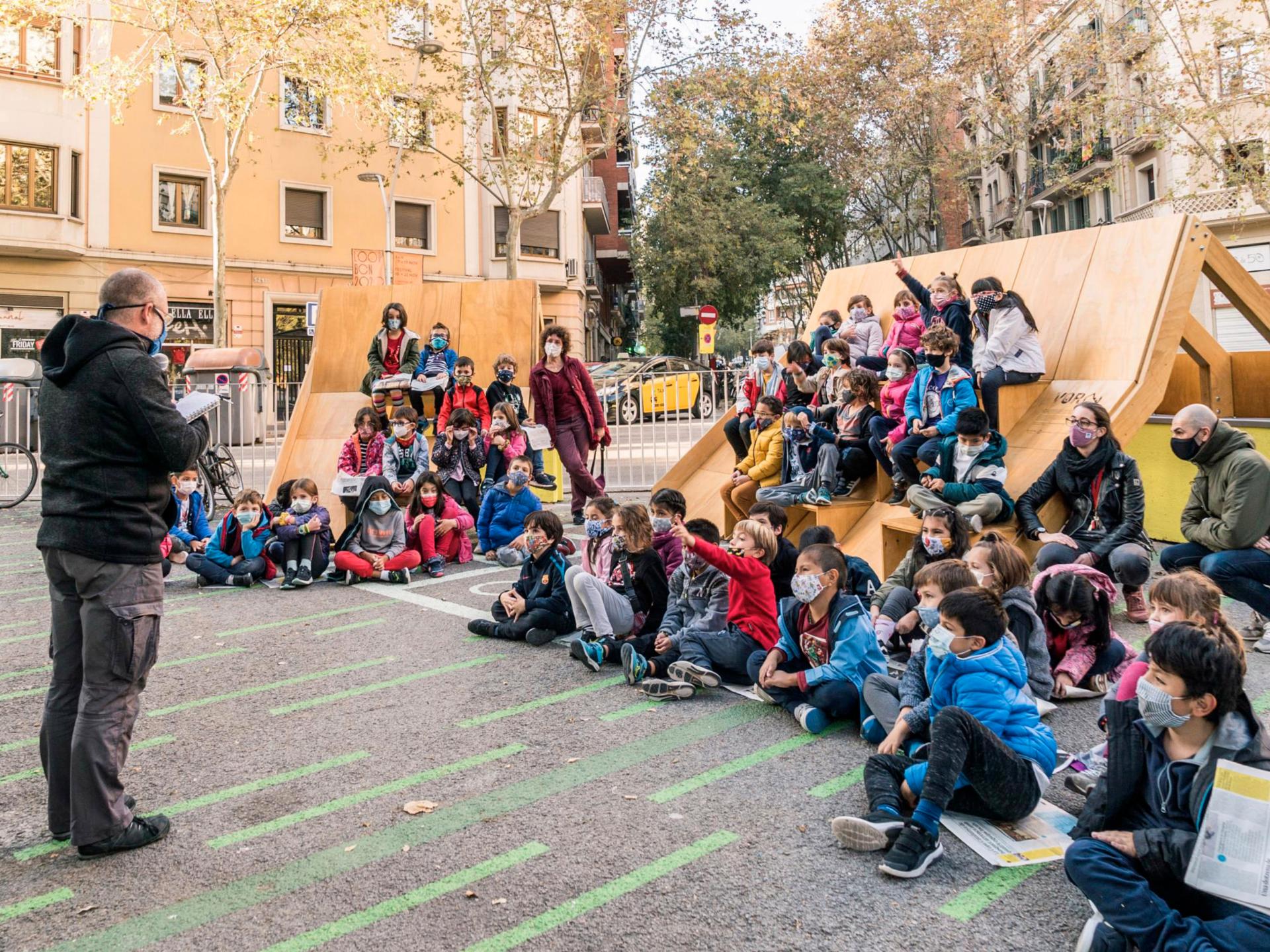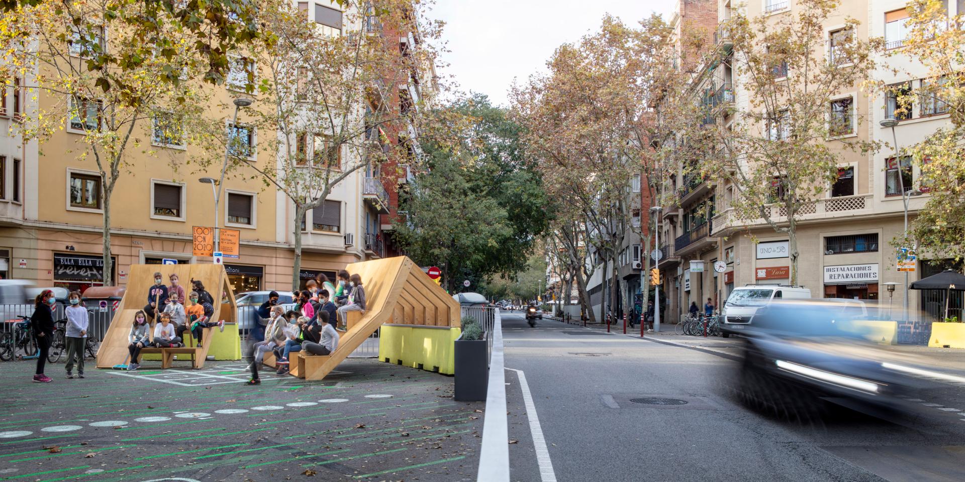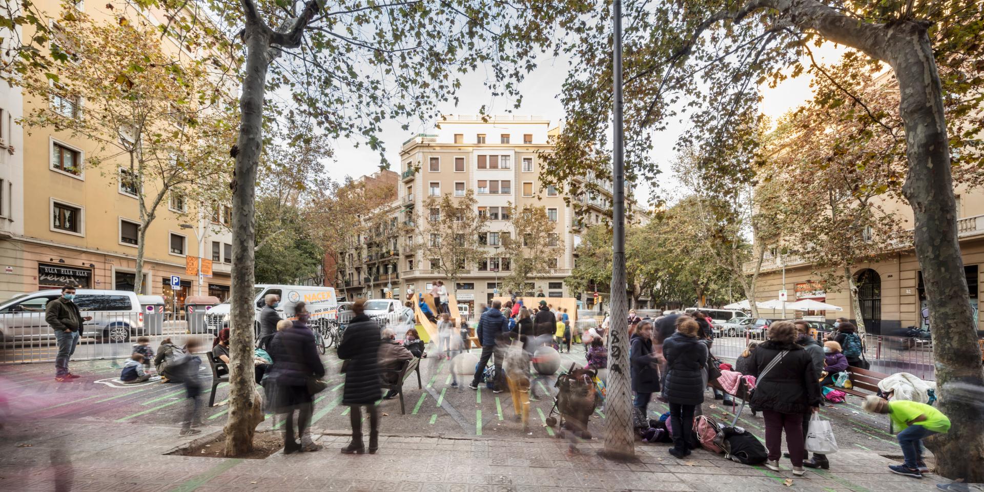 VORA turned a recently pedestrianised road space close to a Barcelona public school into a thriving community hub, temporally activated by different age and interest groups, which often shared the space. The impact of turning five parking places and their adjacent area into a complex public space through simple tactical urbanism mechanisms and the addition of VORA to consolidate the limit between pedestrians and cars is huge. Rather than a generic road space co-opted by traffic, this chamfer became a hub for positive social exchange and community-building.