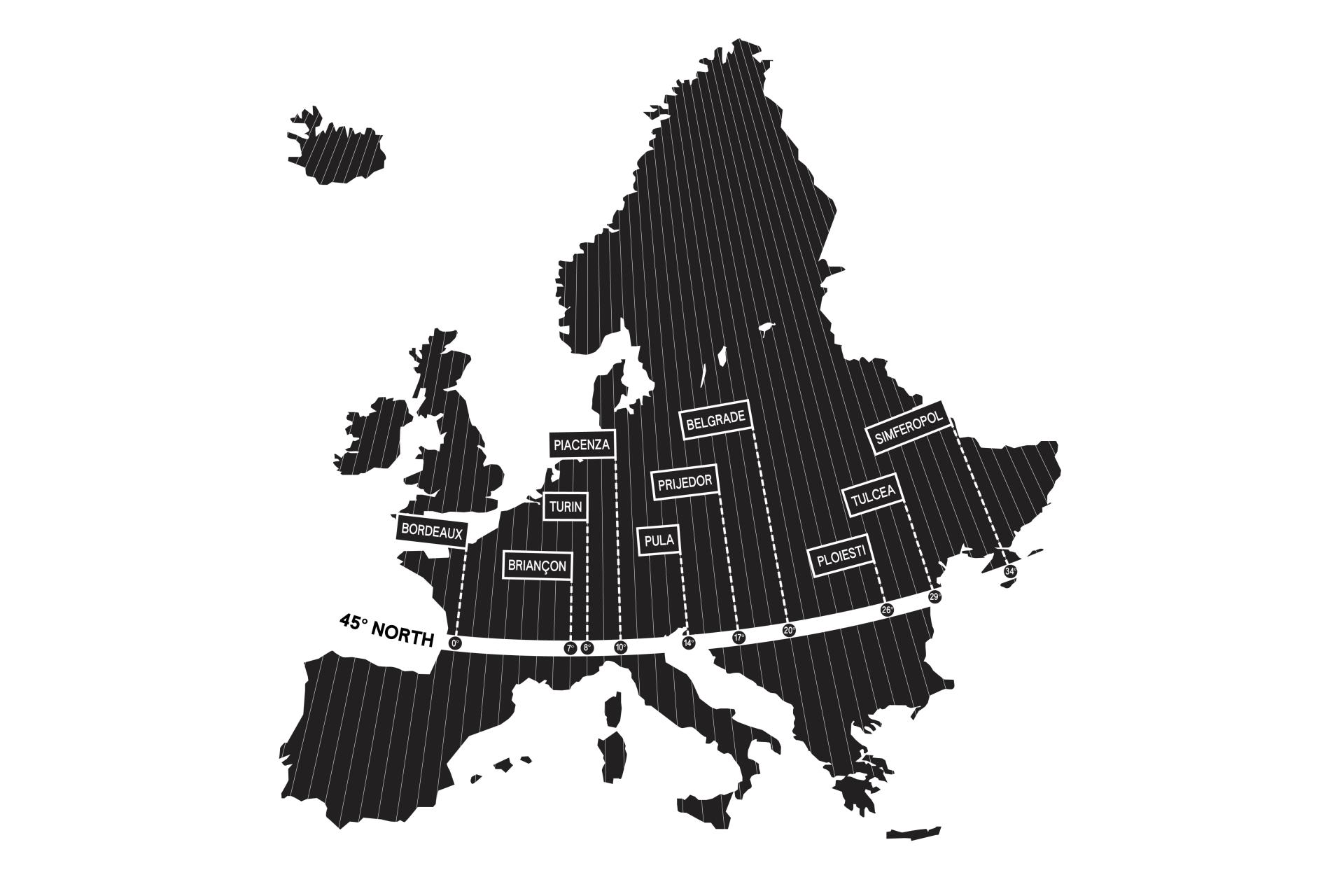 For too long, we have been creating top-down fixed structures to read our planet, trying to describe the world as a whole. We may now recognise the urgency of focusing on conviviality across scales and beings to develop new paradigms. This proposal will investigate Europe through a new real-fictional space, following an exemplary line: the 45ºN parallel. Europe is a hybrid place in constant mutation, formed by movements of people, knowledge, and goods; with multiple climates, geographies, languages, and borders marked by socio-economic and geopolitical struggles. The European culture and values have been developed under the abstract thinking of the “European condition”. Today, after thirty years of its foundation, there is no clear understanding of the attributes that bring a coherent and cohesive narrative of our diverse European identity.