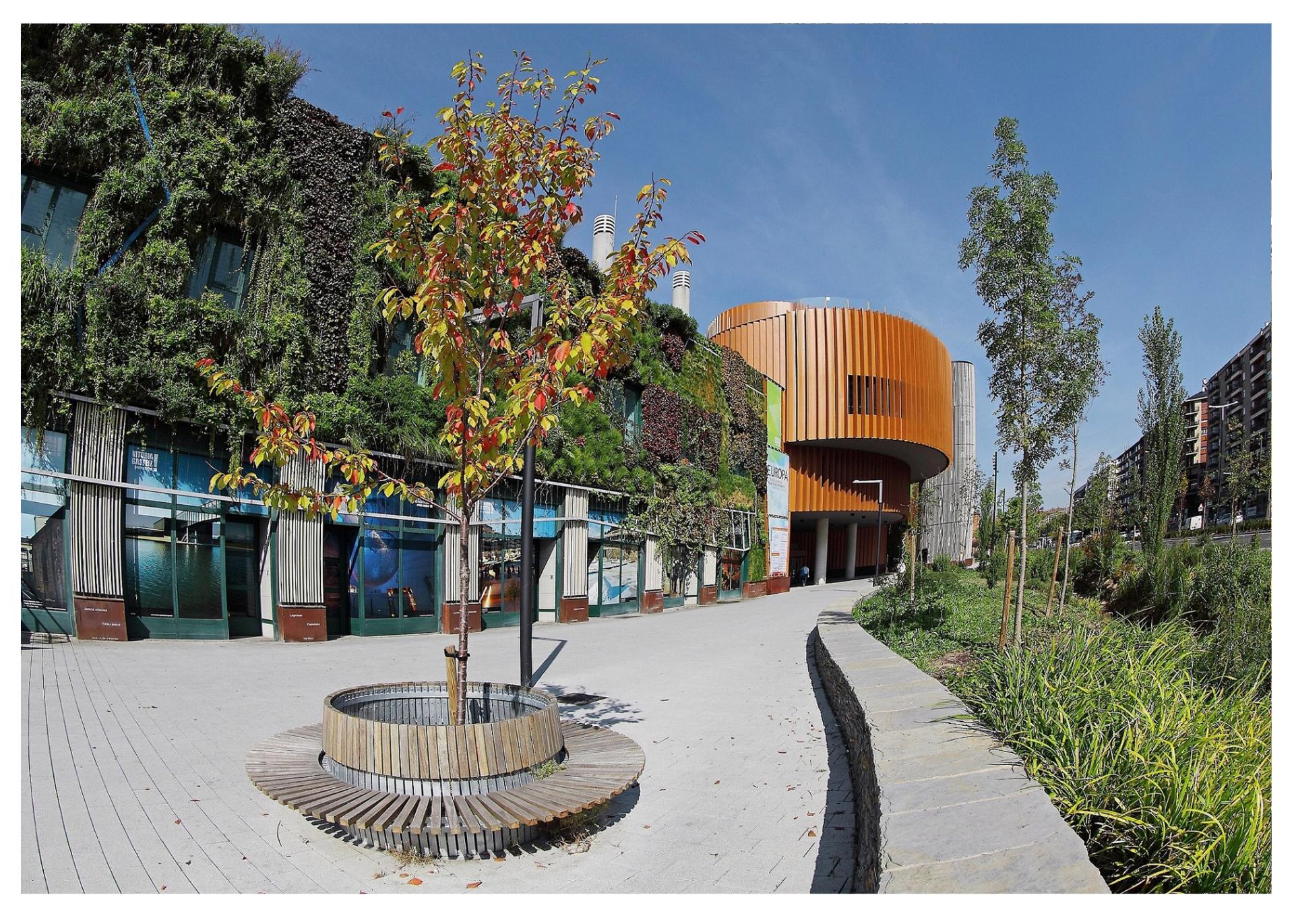 Regeneration of the Europa Congress Centre and its surroundings, integrated both into the city inner green ring. This project is focused on the Energy Rehabilitation and Expansion of a building from the late eighties and on the re-naturalization of the public space around it. The work done is aligned with the extensive environmental trajectory of the city and has been carried out drastically enhancing the natural component and, above all, the incorporation of vegetation both on of the building itself, roof and façade, as well as in the nearby public space, enhancing also biodiversity. This project is encompassed in a city-scale strategy (an inner green ring, and an outer green ring), and at a municipal- scale (a yellow ring of an agro-food strategy).