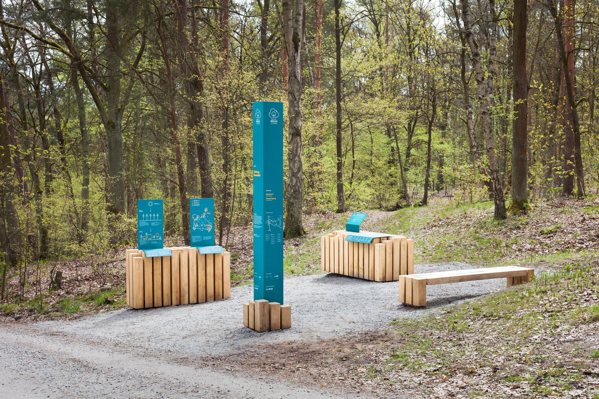 All elements from raised walkways and platforms to benches, exhibition elements, and signs are designed especially for this project. In this way, the uniform design language of Wald.Berlin.Klima. is recognizable from the largest to the smallest scale.