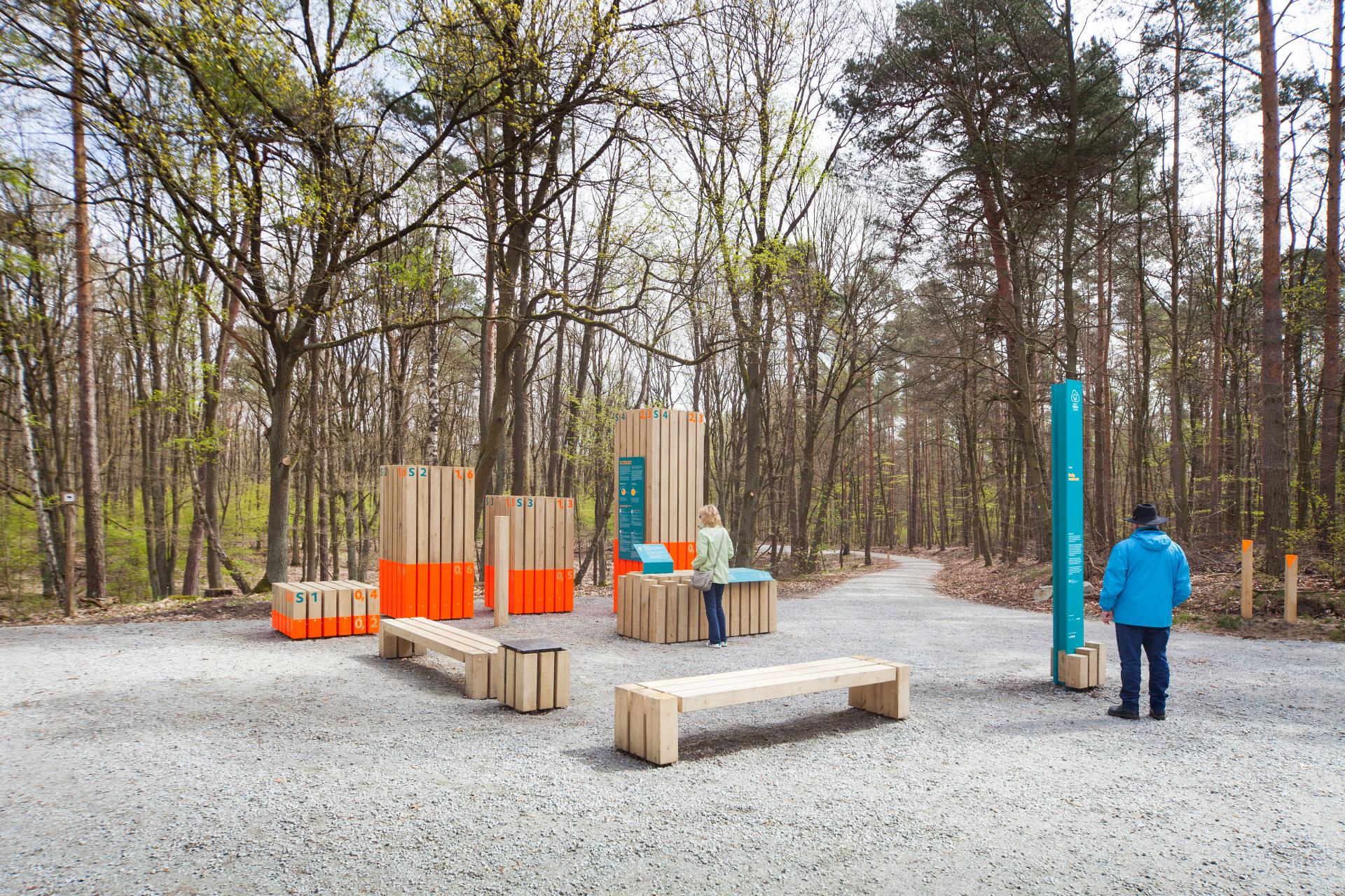 The multi-sensory way the exhibition conveys knowledge is inclusive and easily understandable. The topics follow a didactic principle that makes information accessible gradually. Different individual interests and abilities are taken into account. Beginning with an introductory overview on the orientation markers, the transfer of information ranges from basic knowledge on desk-like signs to in-depth knowledge displayed in infographics and on vertical signs. Further expert knowledge is accessible through scanning a QR code. Spatial installations convey content in playful ways and draw attention to the main object of the exhibition - the forest.