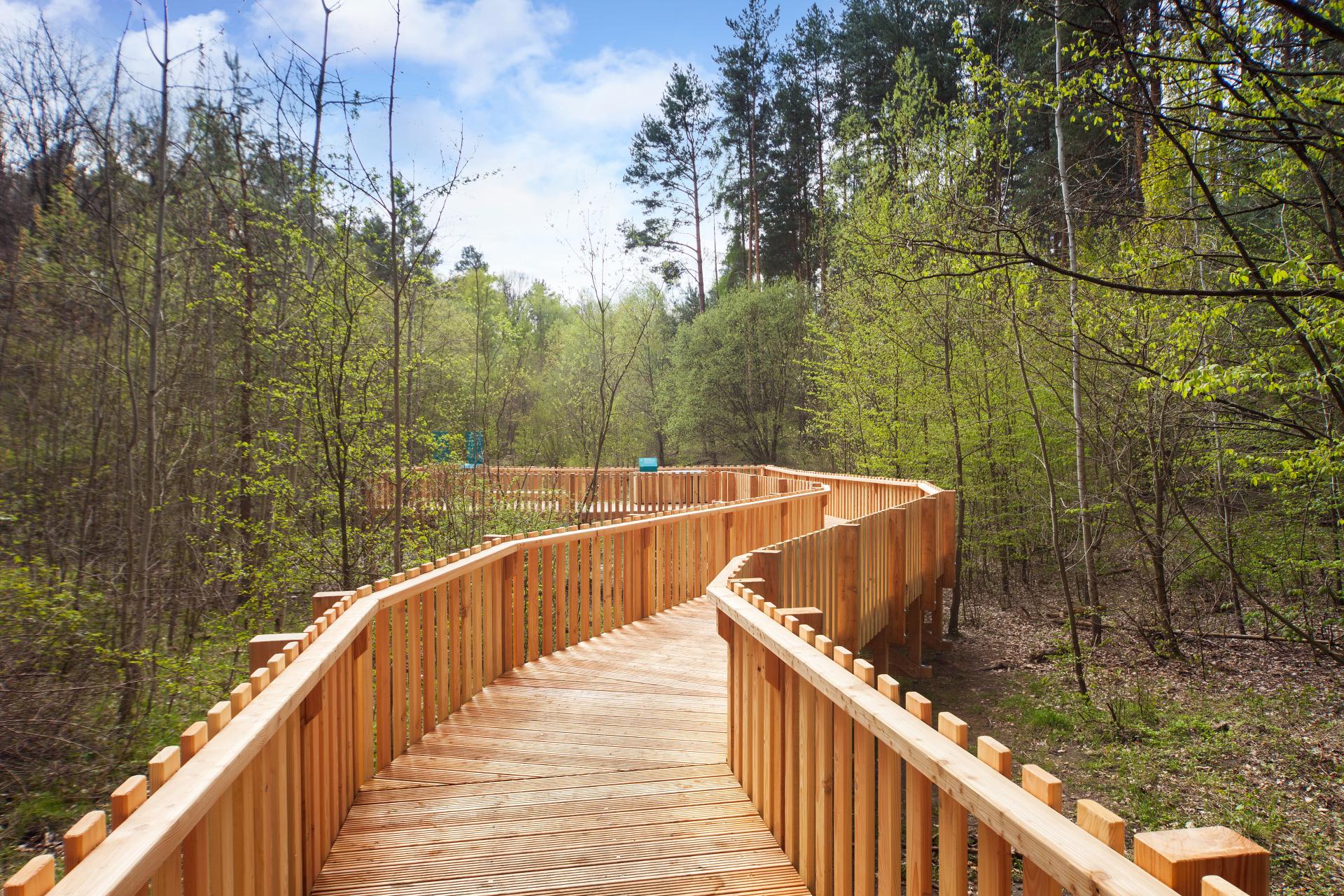 The existing forest landscape is used as an asset. The differences in terrain, morphology, and different habitats of the forest strip are integrated into the planning of the exhibition. Instead of creating artificial exhibits, the visitor is taken outside to experience them firsthand. Viewpoints and elements of interest in the forest are highlighted by the positioning of viewing platforms and installations. In this way, nature is integrated into the construction as the main actor.