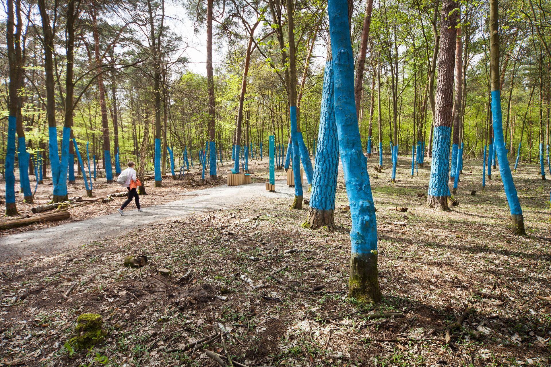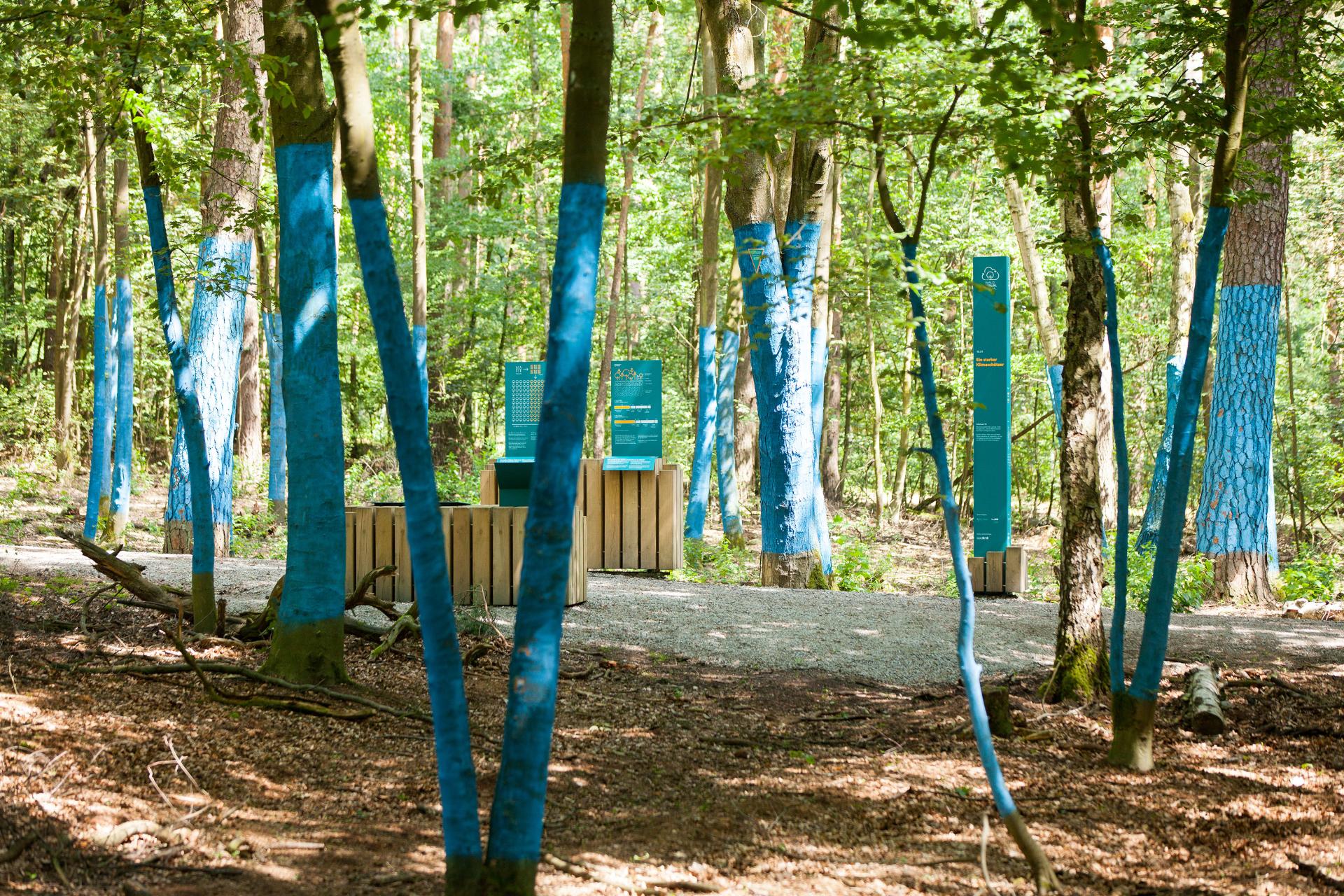 Each of the orthogonal information islands or living rooms tells a story of a different aspect of the forest. Abstract phrases such as CO2 footprint are made visible and easily understandable through impressive installations along the path. At one installation visitors move through a surreal image in the forest where all the trees inside of a 0,5-hectare area have been marked blue. Through this, a visitor comprehends how big an area of forest needed for every Berliner to bind their annual CO2 emission is. A personal connection is achieved.